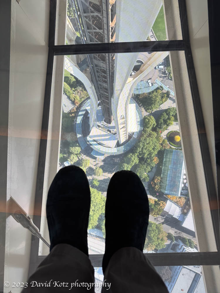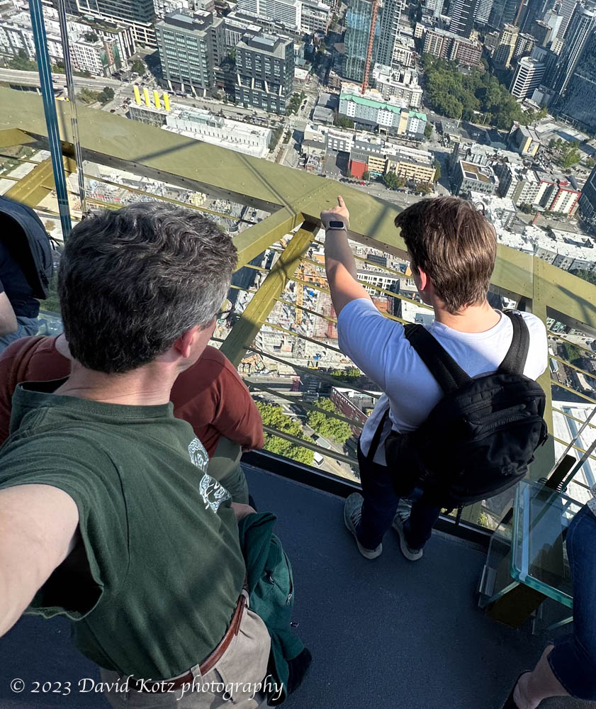 The observation station at the top is actually rotating, about once an hour, allowing a visitor with time to sit and enjoy a drink in a window seat and see all the scenery without getting up. We were short on time, so we walked around the outside ring, looking down past our feet through the glass floor to Chihuly and the park below, and looking out past the safety barrier to the city skyline beyond. Sadly, the air was too hazy to see Mount Rainier.