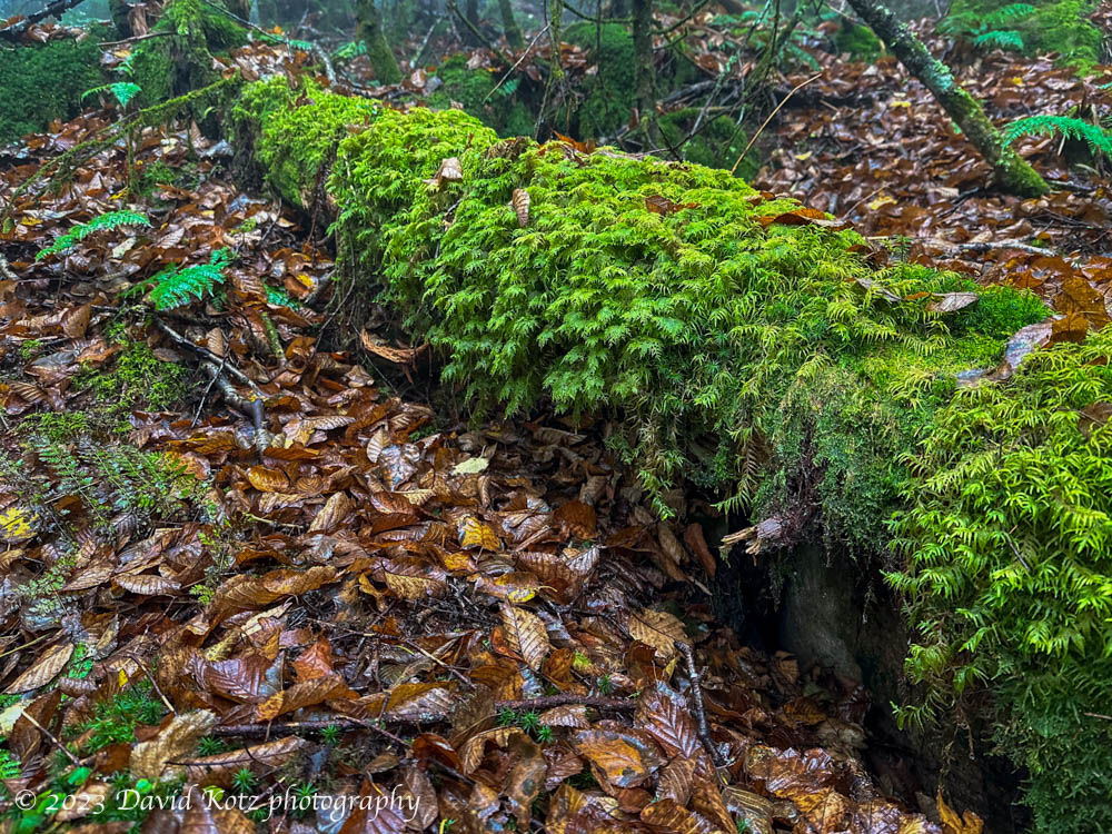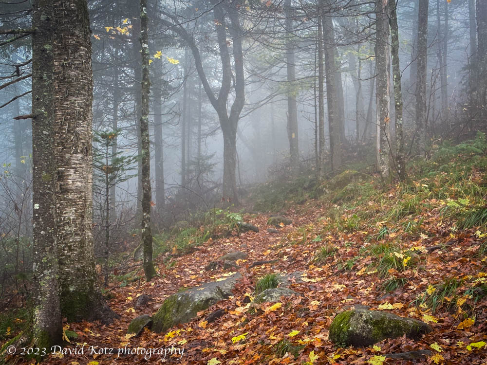 As it happens, we climbed quickly up into the clouds, reaching the cloud deck before we’d topped 3,000′ elevation. Although the clouds eliminated any chance of views from the high points – no views of broad landscapes awash in fall color – it did lead to some ethereal shots along the trail.