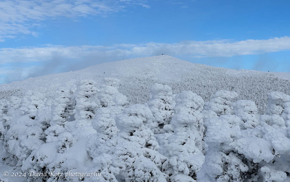 I reached a point where I could see the summit of Moosilauke. Against the starkly white peak I could easily pick out four hikers on the summit, and one approaching from the left (my trail) and one approaching from the right (Gorge Brook Trail). Wow!