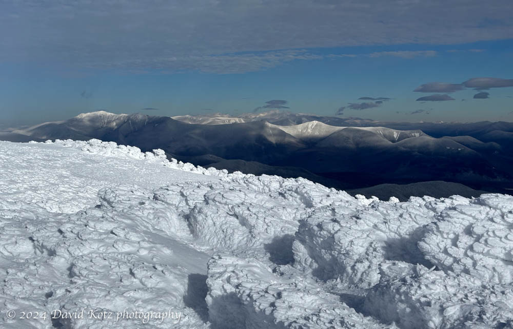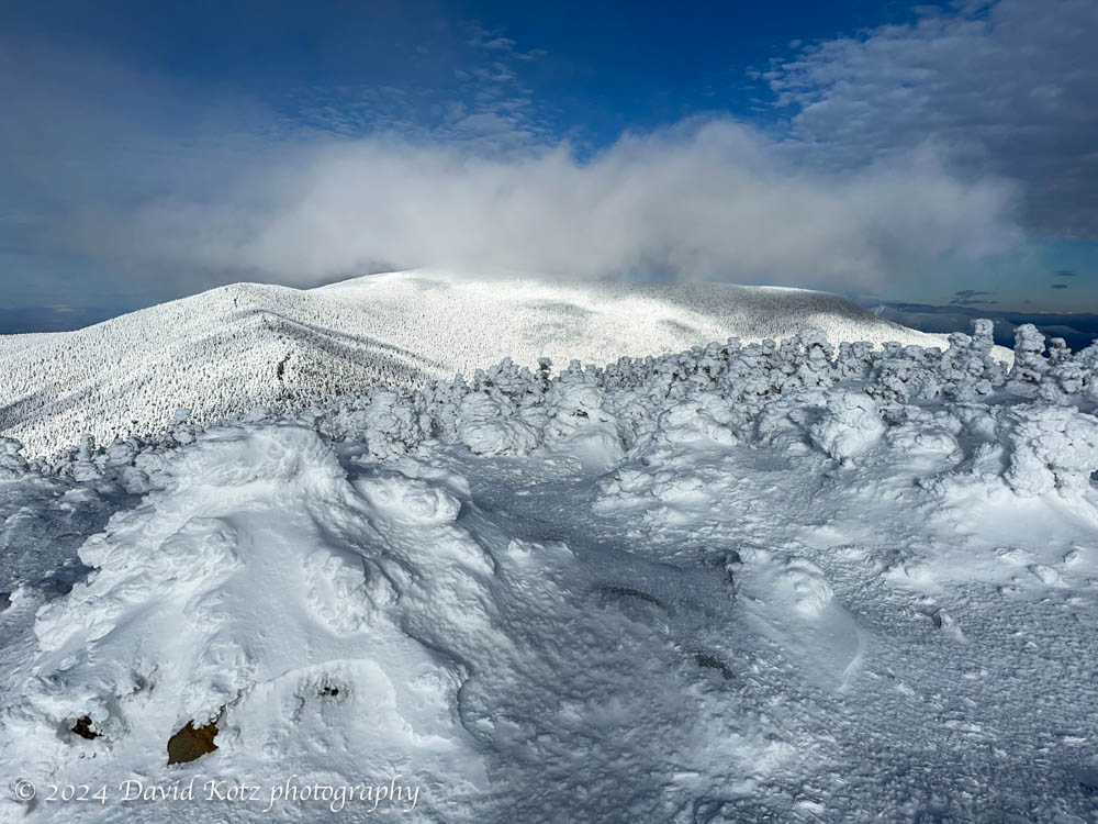 The ridge crossing was creepy, as all the trees were leaning over the trail, burdened with accumulated ice and rime. I’ve seen this trail in many conditions but never quite like this! I had glimpses of views along the way; to my left the Green Mountains of Vermont were crystal clear in their brilliant white coat; to my right were the rolling peaks of the southern White Mountains. Finally, I caught a peek to the northeast, where the Franconia Range was starkly white against a clear blue sky. It would be a fantastic day to summit!
