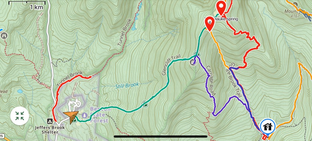 I cruised up the Glencliff trail, passing the familiar sights from many prior climbs. I stopped to chat with some of the other hikers. The first person I met was a solo hiker – on her way down, and likely the first person to summit today – who told me she had summited all the Adirondack 46 in winter more than ten years ago. Impressive! She confirmed today’s trail was well-packed all the way to the summit; I was grateful because I’d forgotten my snowshoes.