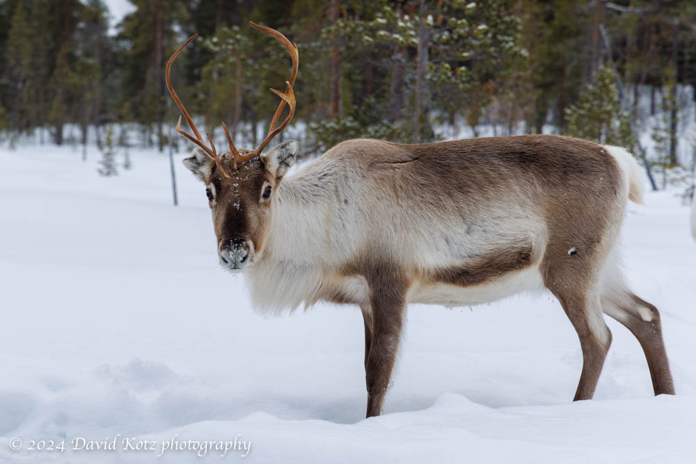 Petri distributed some “reindeer pellets” and the reindeer eagerly gathered to munch on that food [video]. While he and the group chatted, I enjoyed mingling with the reindeer. Most were gathered in a small area where the snow was compacted and hard; but some were resting among the trees in deeper surrounding snow. I tried to get closer, but quickly sank above my knees in the soft snow and decided to stick with the group!