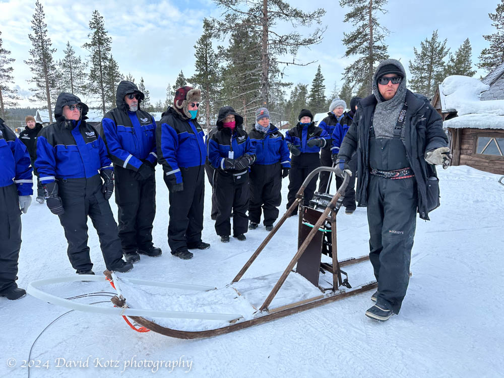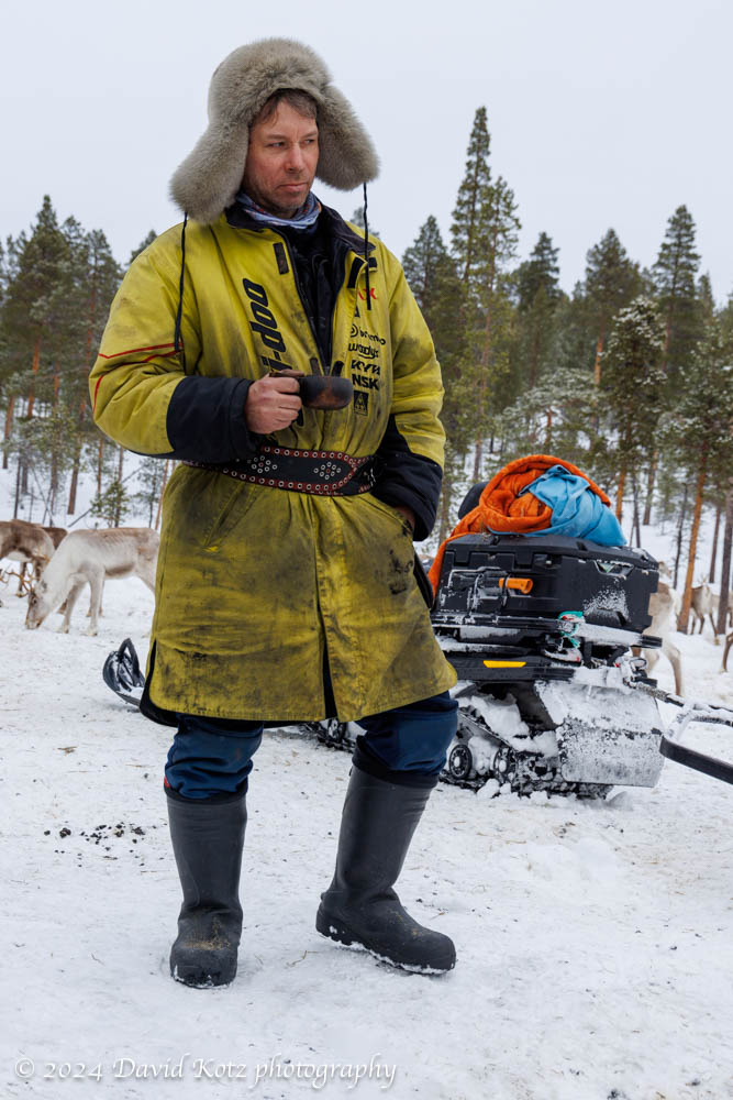 Reindeer Farm. We drove to the home of Petri Mattus, an indigenous (Sámi) reindeer farmer, for a tour of his operation. He and his son bundled us into sleds and their snowmachines were soon whizzing us 10km into the forest and across lakes to locate a group of their reindeer. There, surrounded by a couple hundred reindeer, he lit a campfire, served us tea and coffee, and described the work of a reindeer farmer.
