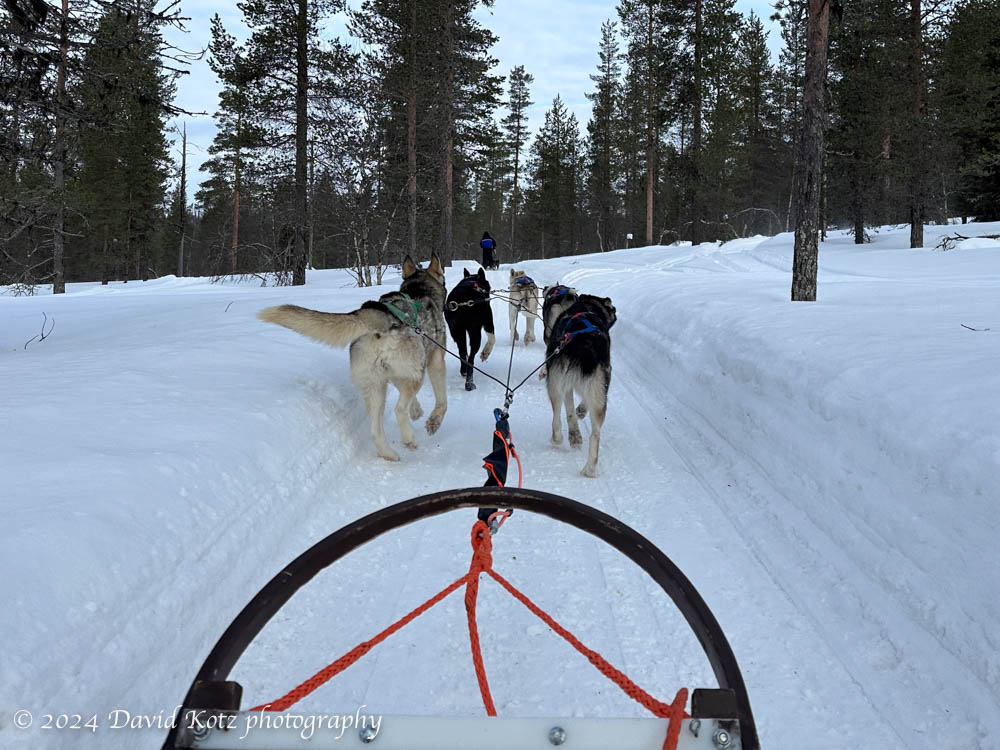 Dogsledding. The next day we were treated to a dogsledding experience. After a 10-minute lesson on how to drive a dogsled, we paired up, mounted our sleds, and off we went! The dogs ran remarkably fast – indeed, our team was so fast we often had to lean on the brake to prevent them from overtaking the sled in front of us. We enjoyed exploring the local scenery – in forests and on open terrain along the hilltops. The dogs were so excited, and so friendly!