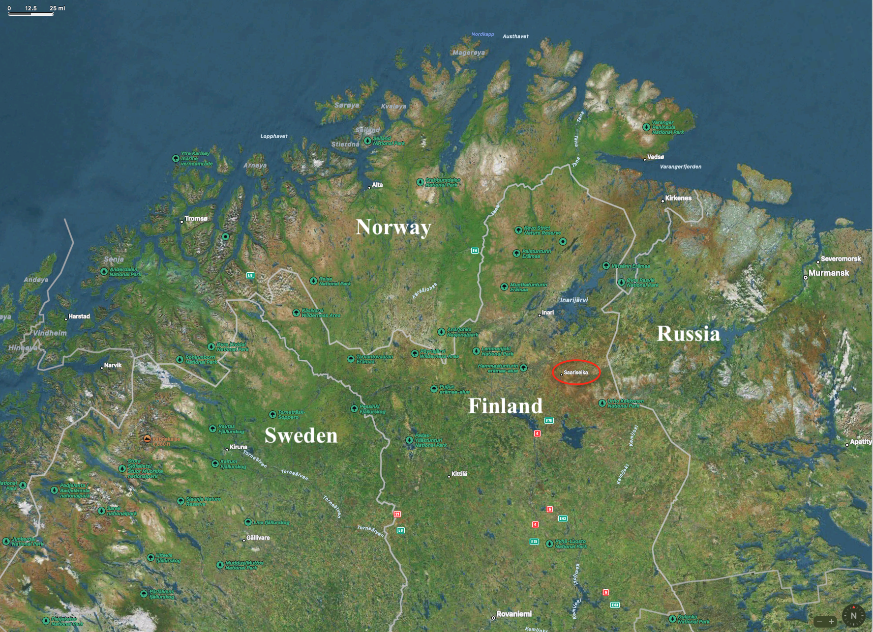 First of all – just where is this place? As you can see at the red oval in the map below, which zooms in on the northern coast of Scandinavia, this town is close to the northern edge of Finland, where it meets Sweden, Norway, and Russia.