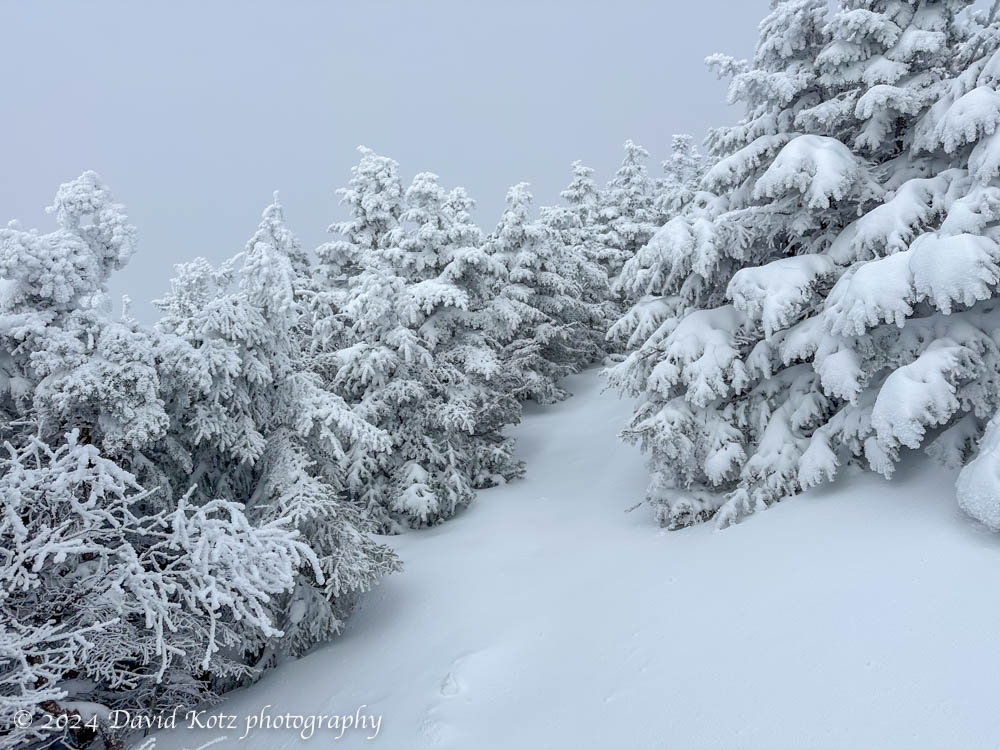 I knew the story would be very different at altitude: in the higher peaks of the White Mountains the rain would have turned to snow sooner, stayed as snow longer, and fallen as dry, fluffy powder. With the weather clearing today, I just had to get up there, up high, to play in this new powder. I was not disappointed. Read on, and check out the gallery of this winter wonderland!