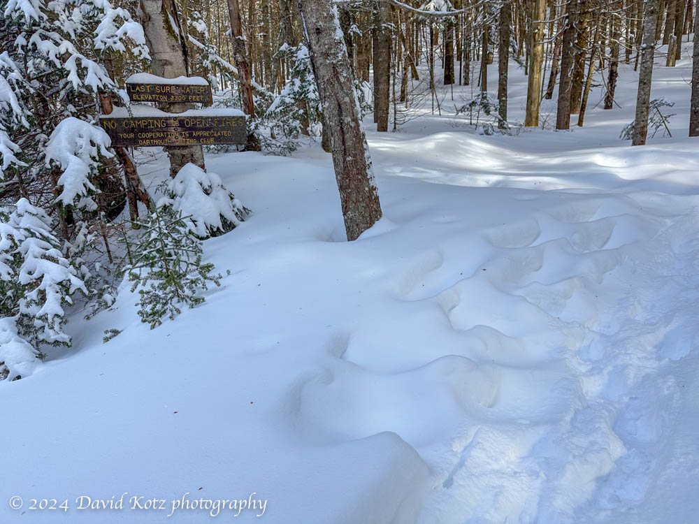 I selected the Gorge Brook Trail on Mount Moosilauke – well-known terrain for me, and a change of scene from the Glencliff Trail I climbed back in February. I parked at 7:40am and headed out along the mountain’s newest trail: Put’s Path, which runs from the winter parking area along the access road to the trailheads at Moosilauke Ravine Lodge. By 8am I was at the trailhead, next to the Baker River, and headed up the Gorge Brook Trail. I was following the tracks of three earlier bare-booting hikers, who were scuffling up the overnight snowfall (a dusting at the start, about 2-3″ near the top) that covered faint tracks of the first skiers and hikers who broke out this trail after the storm Friday.