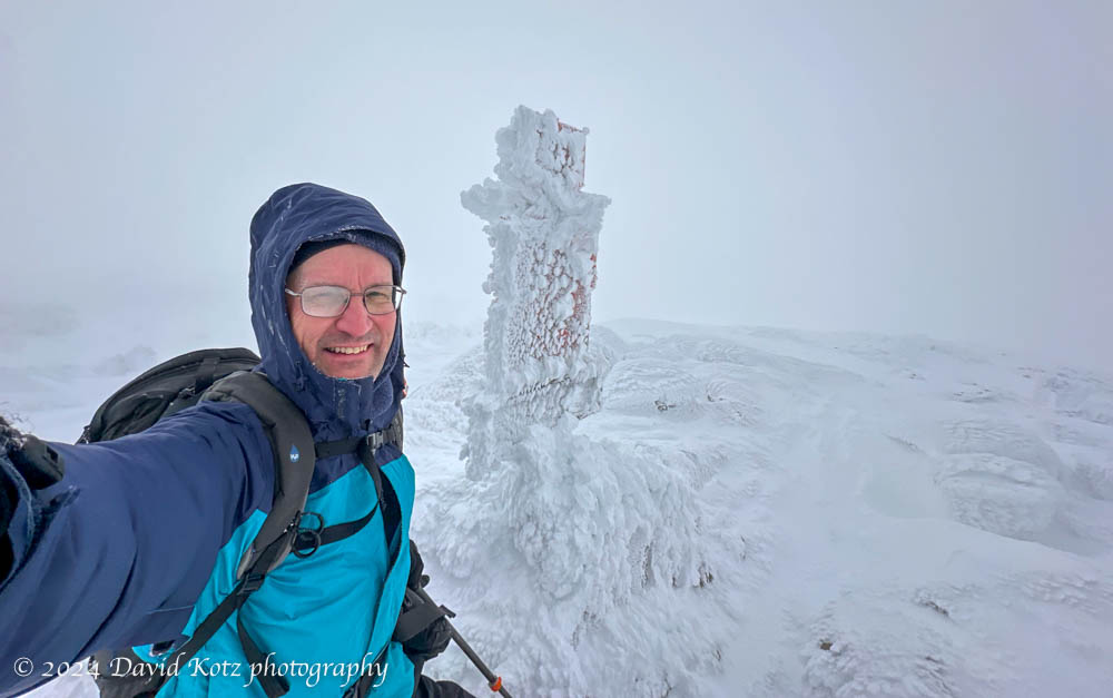 I was now breaking trail – today’s first tracks – as I climbed toward the Jobildunc outlook, the Balcony, and the East Peak. I was in the clouds – zero views – but the wind was calm, the temperature mild, the trees laden with snow, and the only other tracks were those left by snowshoe hares and pine martens on their morning commute to breakfast. A beautiful morning!