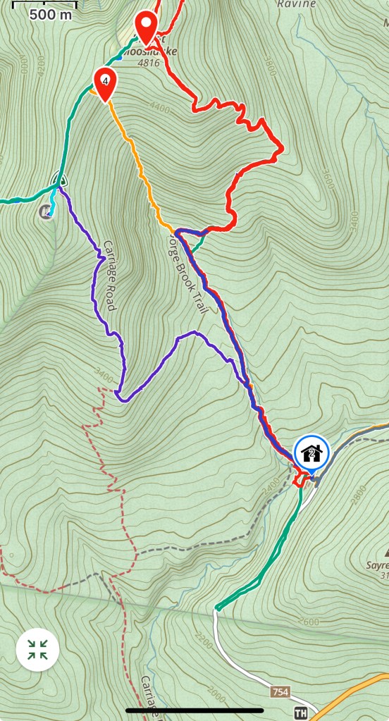 It’s hard to see today’s track, what with all my earlier tracks cluttering the map. Today is teal; it starts/ends near the bottom/center of the map. It follows the purple and red tracks to the summit, and back.