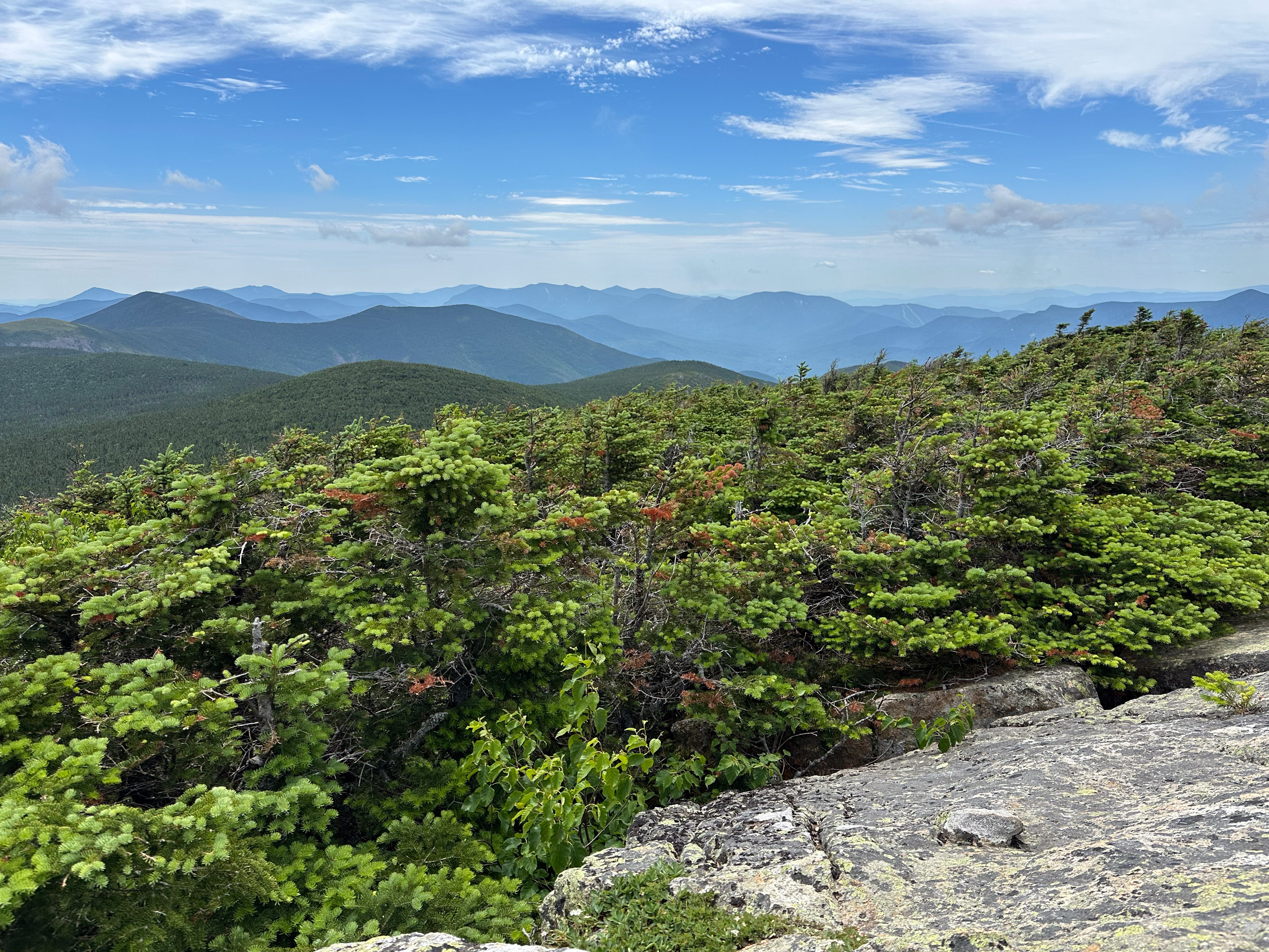 We then headed up the short but incredibly steep trail to the summit of South Twin, scrambling over and around large boulders. I recall descending this trail with a full pack, back in September 1982, and thinking it was one of the steepest trails I’d ever seen. On the summit we enjoyed expansive views across the Pemigewasset River valley, and the surrounding peaks of the Franconia Range and the Bond range, while clouds dotted the sky. In the eastern distance, clouds clung to the Presidential Range, giving us only momentary glimpses of Mount Washington. The day was warm, and the humidity near 100%, lending a blue haze to the more distant views, but looking homeward I could easily see Moosilauke, Cube, and Ascutney.