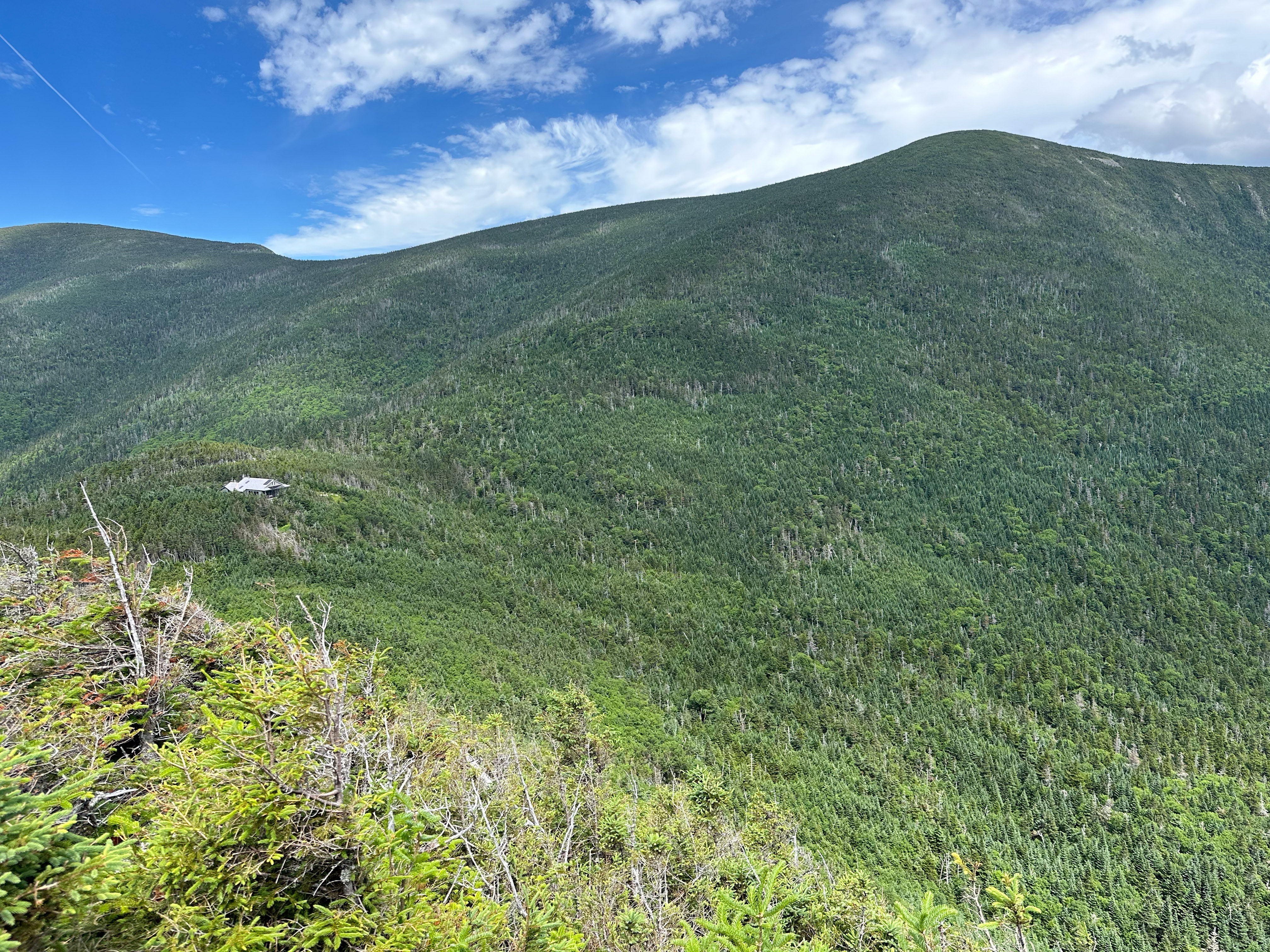 After a leisurely summit lunch, listening to my favorite bird song – from the white-throated sparrow – we stomped back to the hut for another rest. At this point my friends left for home; I was planning to stay overnight. I climbed the nearby Galehead Mountain barely a quarter of a mile away. It had no view from the top, but a nice view back to the hut from a viewpoint.