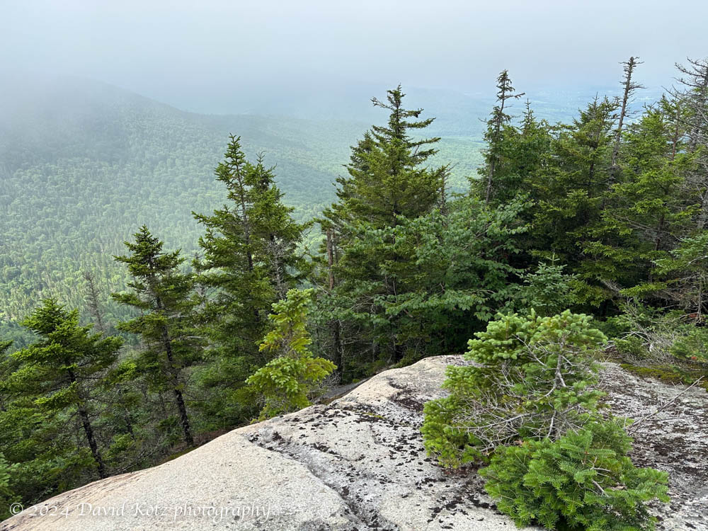 We soon topped the ridge, found the cabin once used (long ago) by the ranger who tended the firetower (long gone), then climbed further to the wooded summit. Surrounded by trees, it has no views – an otherwise unredeeeming 4000-footer peak. We pressed on… dropping several hundred feet and passing by the left flank of The Horn. Here, my son opted for a nap while I climbed the short spur trail to the rocky summit. Fortunately, the clouds had lifted and I had some fine views back along our route (shown at top of this page), and to the west and north. Now I see why The Horn is on the “fifty-two with a view” (52WAV) list! A dark cloud loomed to the west – and then, rather menacingly, it rumbled slightly. Time to leave the summit!
