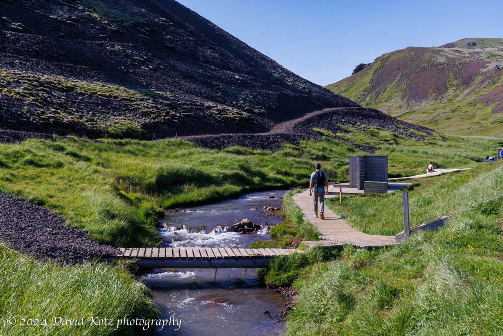 While looping back from the above sites we had time for another stop… and decided to find some wilderness hot springs. Little did we know it would be a 4km hike up a steep slope and into a remote valley! It was a beautiful day, however, so we wound our way through open terrain with ever-expanding views, passing small hot-pots of bubbling mud and following a beautiful stream through meadows and scree fields. Eventually we arrived at a place where a hot stream met a cold stream, with boardwalks on either side. A hundred people were congregated there, laying in the shallow stream, enjoying the bathtub-like warm water, sunshine, and blue skies. This turned out to be our only significant hike of the trip, and was worth it. For more photos, see the gallery.