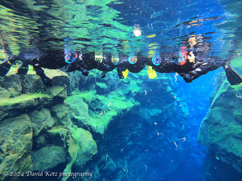 At the bottom of the Þingvellir valley, the stream flows through the chasm of the mid-Atlantic rift itself. The water is cold and clear, having been filtered for decades as it flows slowly through porous volcanic terrain further uphill. We arrived at 9am for a pre-arranged snorkeling trip, where our guide @dorisviking helped us dress in dry suits, masks, snorkels, and flippers. We were soon snorkeling through the frigid (3ºC) water, quite comfortably. There was little or no animal life, but the algae was prolific and beautiful in its own way. The clear water allowed crisp views deep into the chasm below. Fun! For more photos, see the gallery.