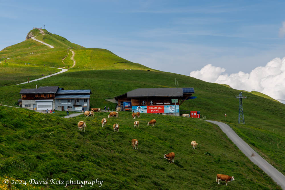 The trail follows a meandering path through green meadows, through cow pastures, past the top of the “Männlichen” gondola, and then climbs to a narrow promontory. It really is as sharp as it looks!