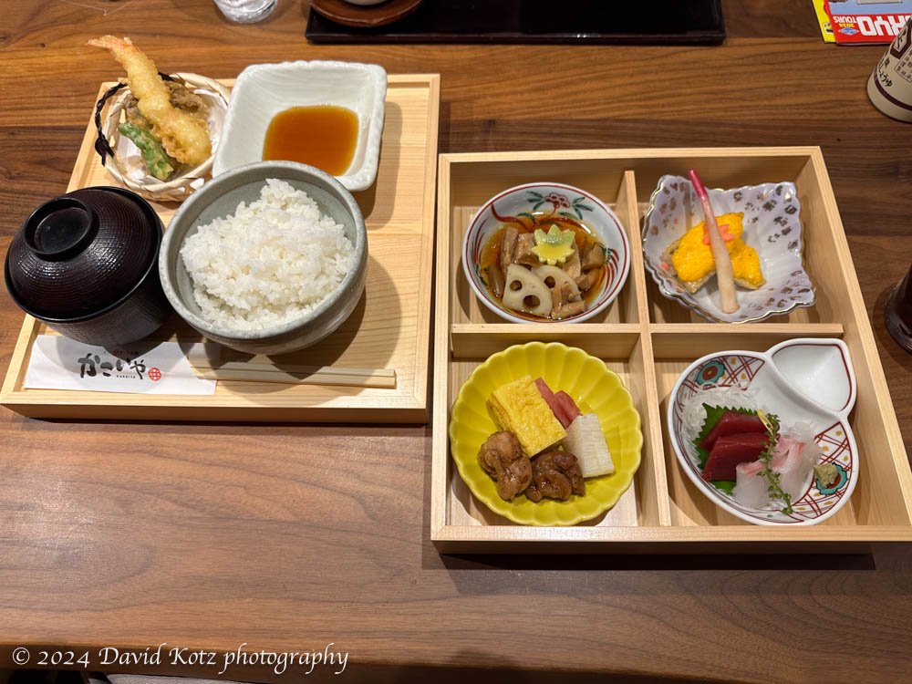 The weather was sunny, hot, and very humid – a condition that will persist throughout our time in Japan, and a reminder that Typhoon Shanshan had passed through a day before our arrival. My photo gallery captures a few snapshots from around central Tokyo and along the train ride. (Below are two ‘appetizers’ – a lunch in Tokyo, and the bullet train after arriving in Kobe.)