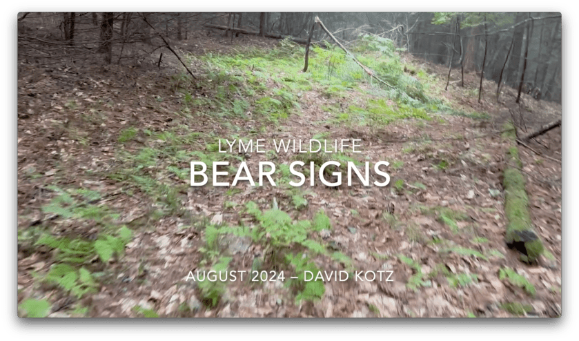I’m learning more about bear sign – clues in the woods that demonstrate the presence of bears. This video shows two of the more dramatic examples, in which a bear marked territory by knocking down a tree, and in which a bear left scat after gorging in a farmer’s cornfield.