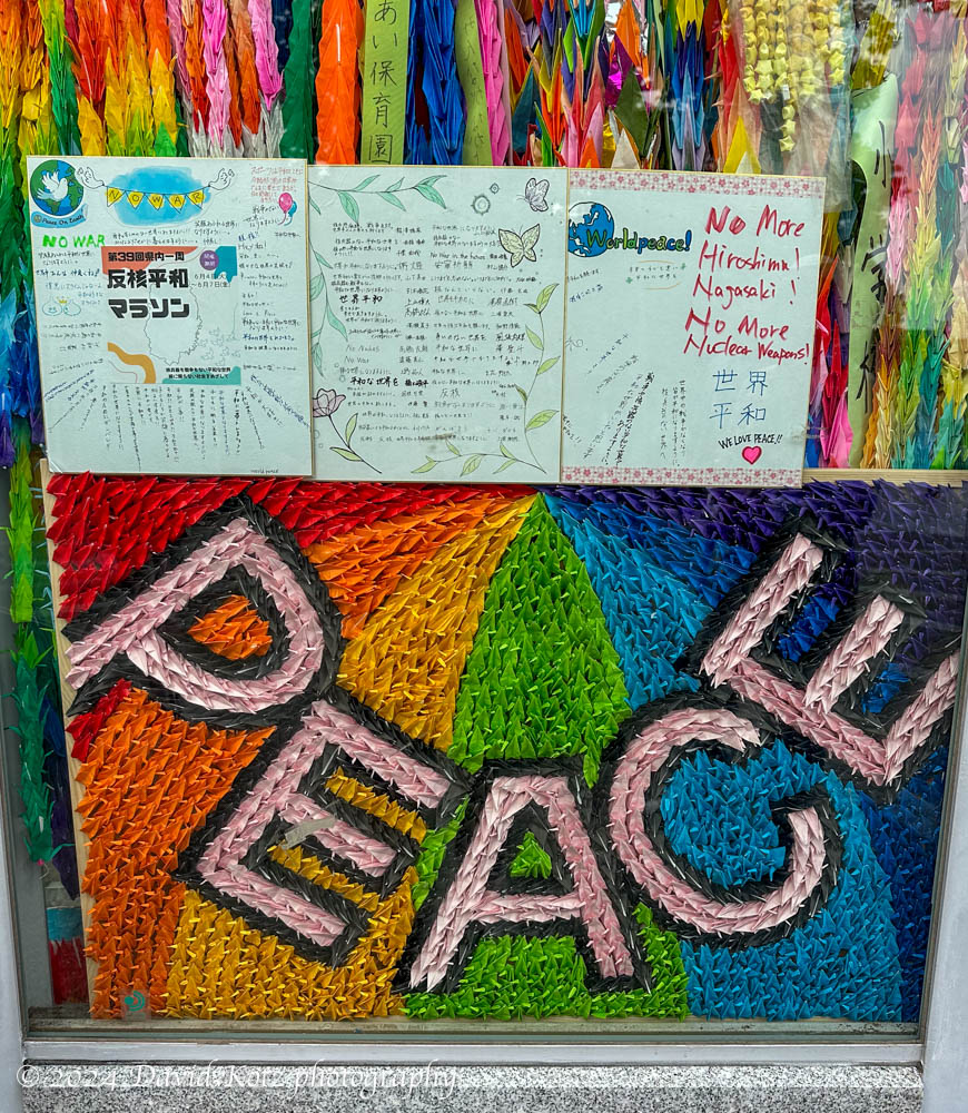 This mural is made of hundreds of tiny paper (origami) cranes, made by children.