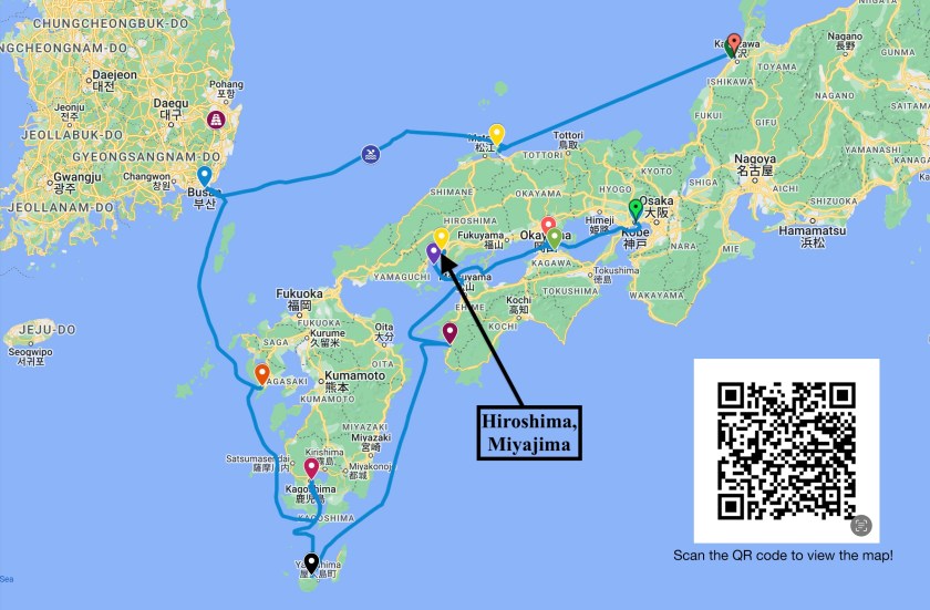 Our trip around Japan has thus far been fascinating, as we experience the beauty of its landscape, the depth of its culture, and the friendliness of its people. Our afternoon visit to Hiroshima, however, was profoundly humbling and thought-provoking. Now a bustling metropolis of 1.2 million people sprawling across the broad delta of a river pouring into Japan’s inner sea, it was hard to visualize the day, just over 79 years ago in August 1945, when the Enola Gay dropped the world’s first nuclear weapon here – then a city of 350,000 souls. By the end of that year, 140,000 people had died. Please read on.