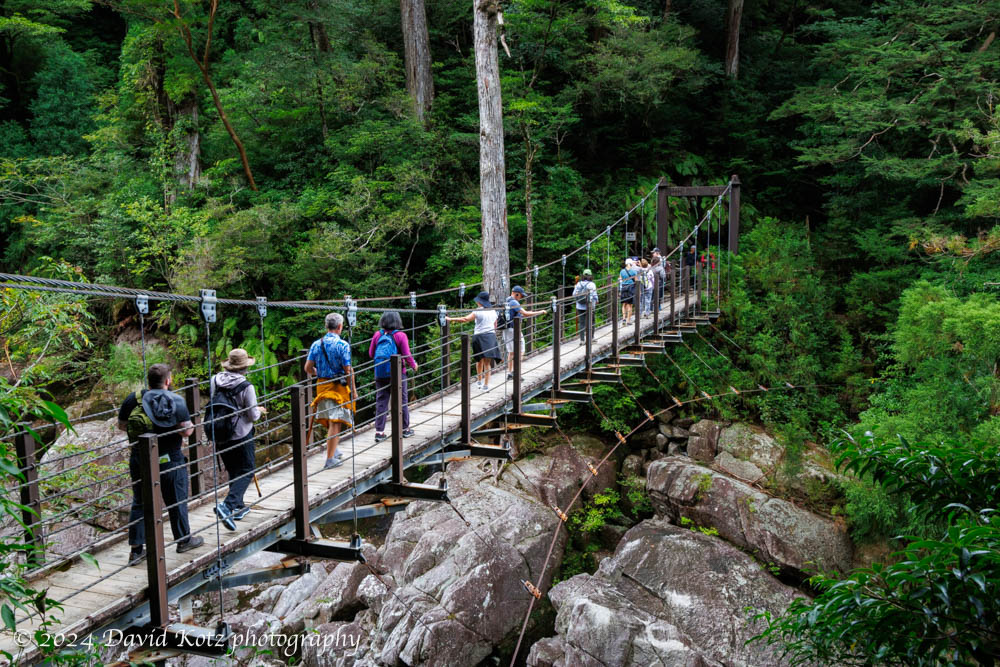 The trails wandered through the forest; although we followed some ‘natural’ paths – directly on soil, clambering over rocks and roots – most of the main trails were, essentially, boardwalks or stone cobbles. Given the steep slopes, the heavy visitation, and the incredibly wet climate, I’m sure it was necessary! We crossed on suspension bridges over a beautiful brook, several times, enjoying its cascades over huge granite boulders. As we returned to the bus we caught a glimpse of a local resident – a red-bottomed macaque (Yakushima macaque) – but never encountered the reclusive sika deer (yakushika).