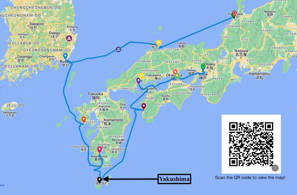 Overnight, the Resolution sailed out of the inland sea and south along Japan’s east coast. We spent the morning at sea, leaving Japan’s mainland behind as we headed for Yakushima Island. A small, round island, it is very tall – with 45 peaks over 1000m, made of granite – formerly, a lava plug inside a much taller volcano. It is one of the world’s wettest locations; the “annual precipitation in Yakushima is one of the world’s highest at 4,000 to 10,000 mm (160 to 390 in)” [Wikipedia], and its highest reaches are now a UNESCO world heritage site because it is covered in virgin forest. Read on, to learn more about our hike on this greenest of green islands.