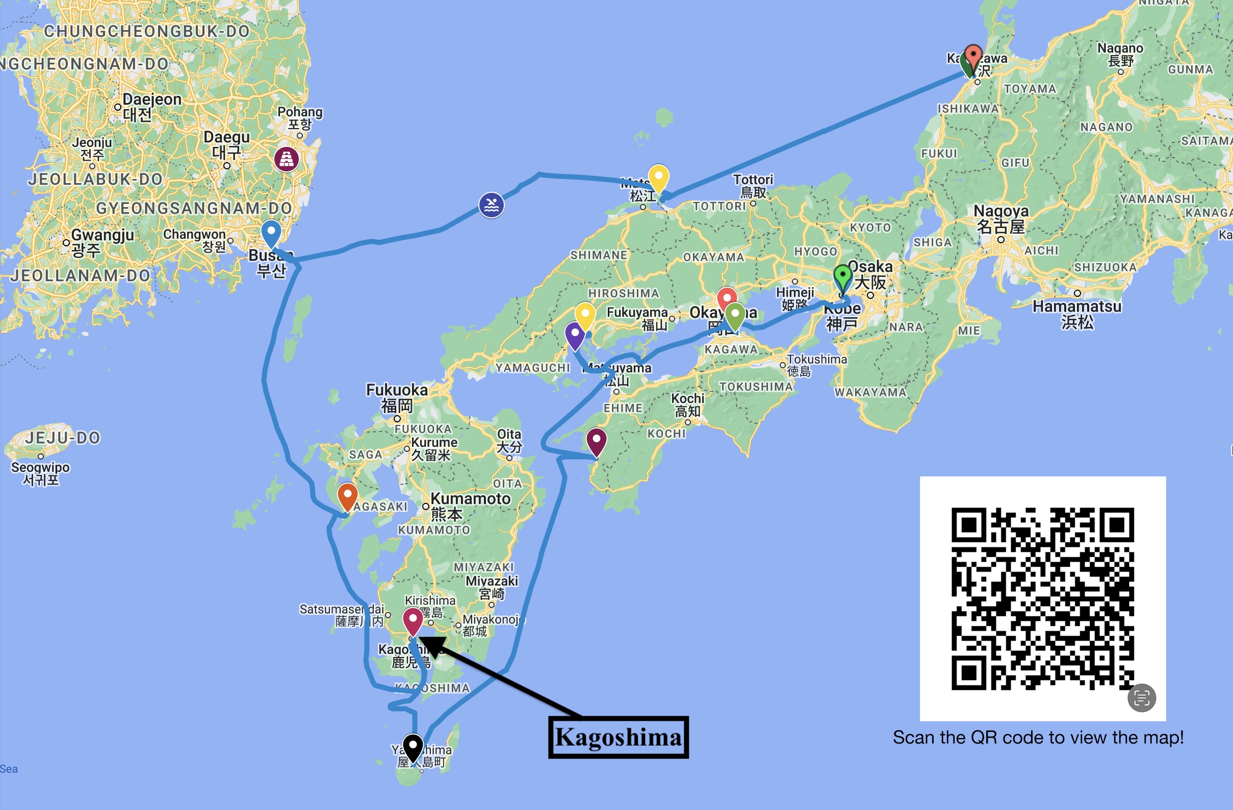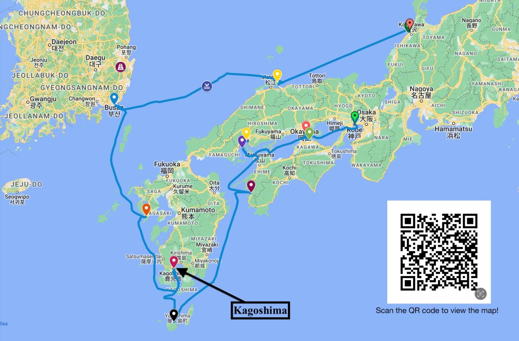 We sailed overnight back to the Japanese mainland, aiming for the city of Kagoshima, close to the southern tip. As usual, several of us were out on deck to enjoy the sunrise and our passage into port. Today, though, the ship paused as it arrived in port. Our berth in the port was taken by another ship, whose captain was missing! Several emergency vehicles were visible on the pier, leaving us mystified about the situation. Our bridge crew, and expedition team, pivoted remarkably quickly – and the ship moved around to the other side of the city and docked at the shiny new marine terminal (that is, a cruise-ship terminal). Although a beautiful location, it was farther from the center of town and thus farther from the ferry we were intending to catch. The expedition team did a fantastic job reshuffling all the schedules for the day, and soon we were on a bus to the ferry terminal. It all worked out… read on!