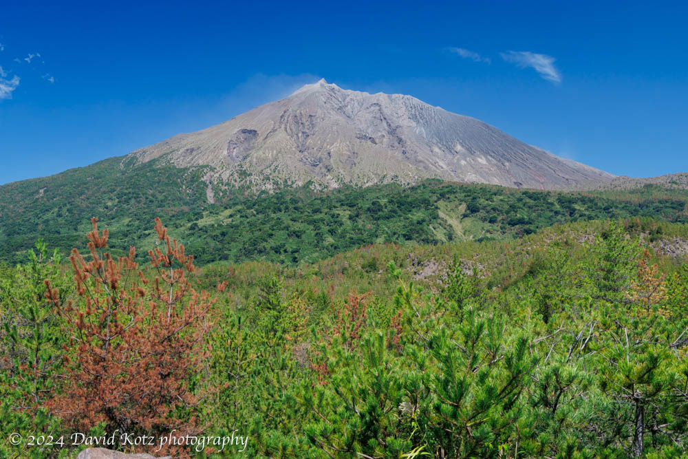 The bus drove right onto the ferry for the short, fifteen-minute commute across a narrow inlet to Sakurajima volcano, formerly an island but (due to a 1914 lava flow blocking the inlet on the other side of the volcano) it is now a peninsula. Sakurajima means “cherry [tree] island”, historically dotted with lush cherry blossoms in the spring. We drove around to an observation point where we had good views from the southeast side of the volcano. Classically shaped, the upper slopes are steep and devoid of plants; most of what is visible is ash, because the mountain spews new ash almost every day. (None was coming out as we watched from the observation point, but there was plenty alongside the path.)