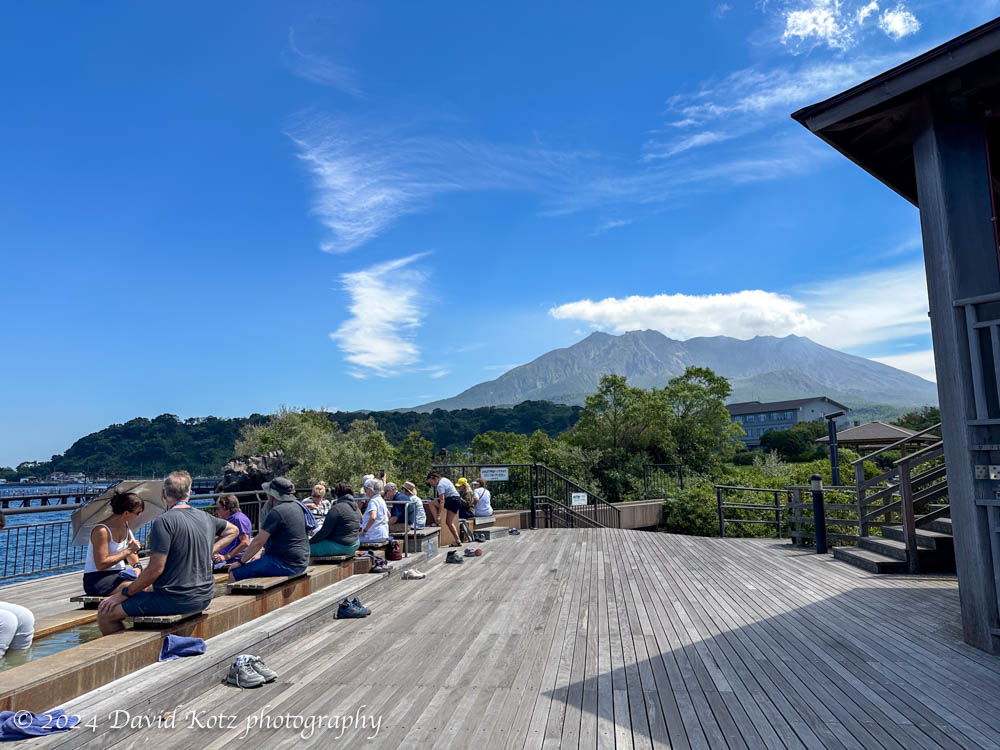 On the way back to the ferry we stopped at a public park centered around a hot spring, which was piped onto shallow channels alongside several benches, allowing us (and other visitors) to enjoy a pleasant foot bath while staring up at the volcano – now puffing a bit of smoke and ash.