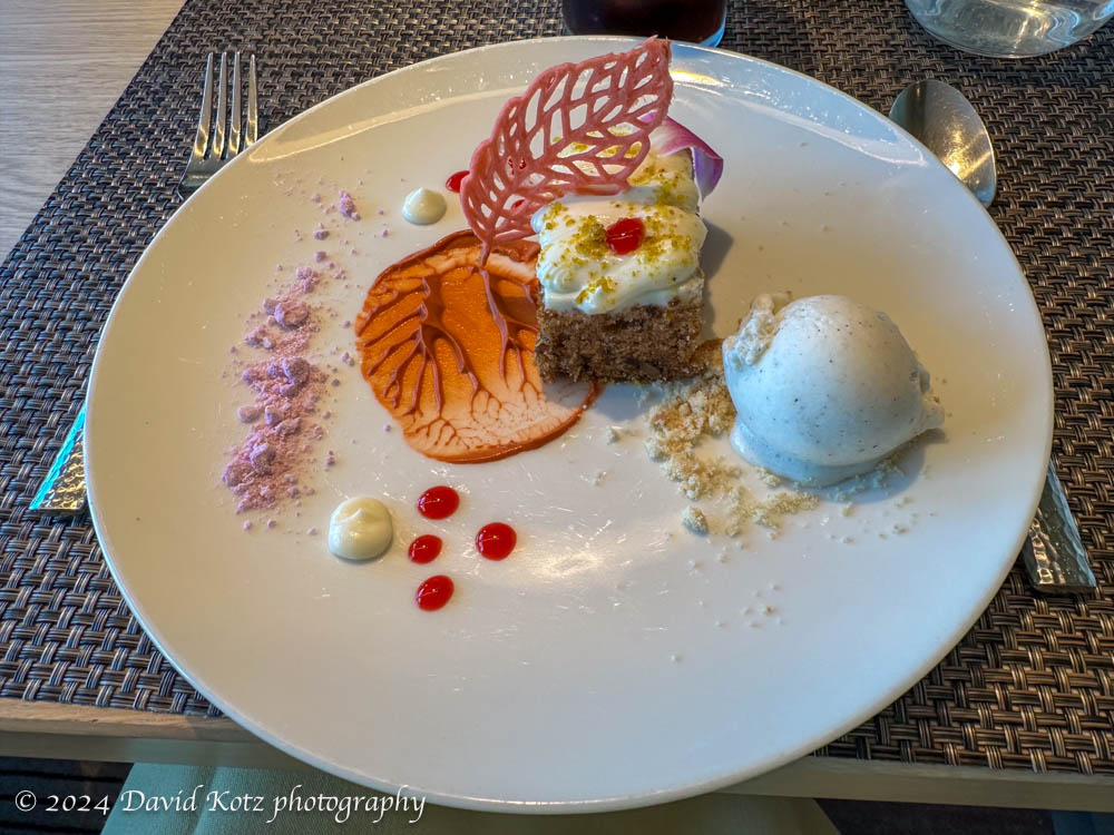 The food was fantastic, at every meal. Breakfast was an extensive buffet; at lunch and dinner there were always at least three entrees and two or three delectable desserts, different every day. One dinner, by invitation each evening, highlighted the creativity of the chef along the theme of ‘zero food waste’ [video]. The gallery includes some food photos!