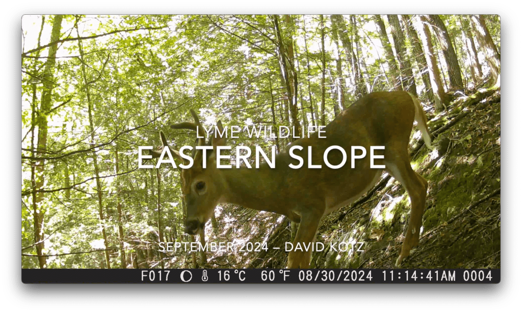 Eastern slope. I placed two cameras at adjacent trees along a game trail on the eastern slope of the hill, sometimes allowing me two peeks at the same passing animal. This video shows incredible variety: deer, bear, squirrel, chipmunk, mouse, raccoon, porcupine, coyote, and a tantalizing couple of bobcats.
