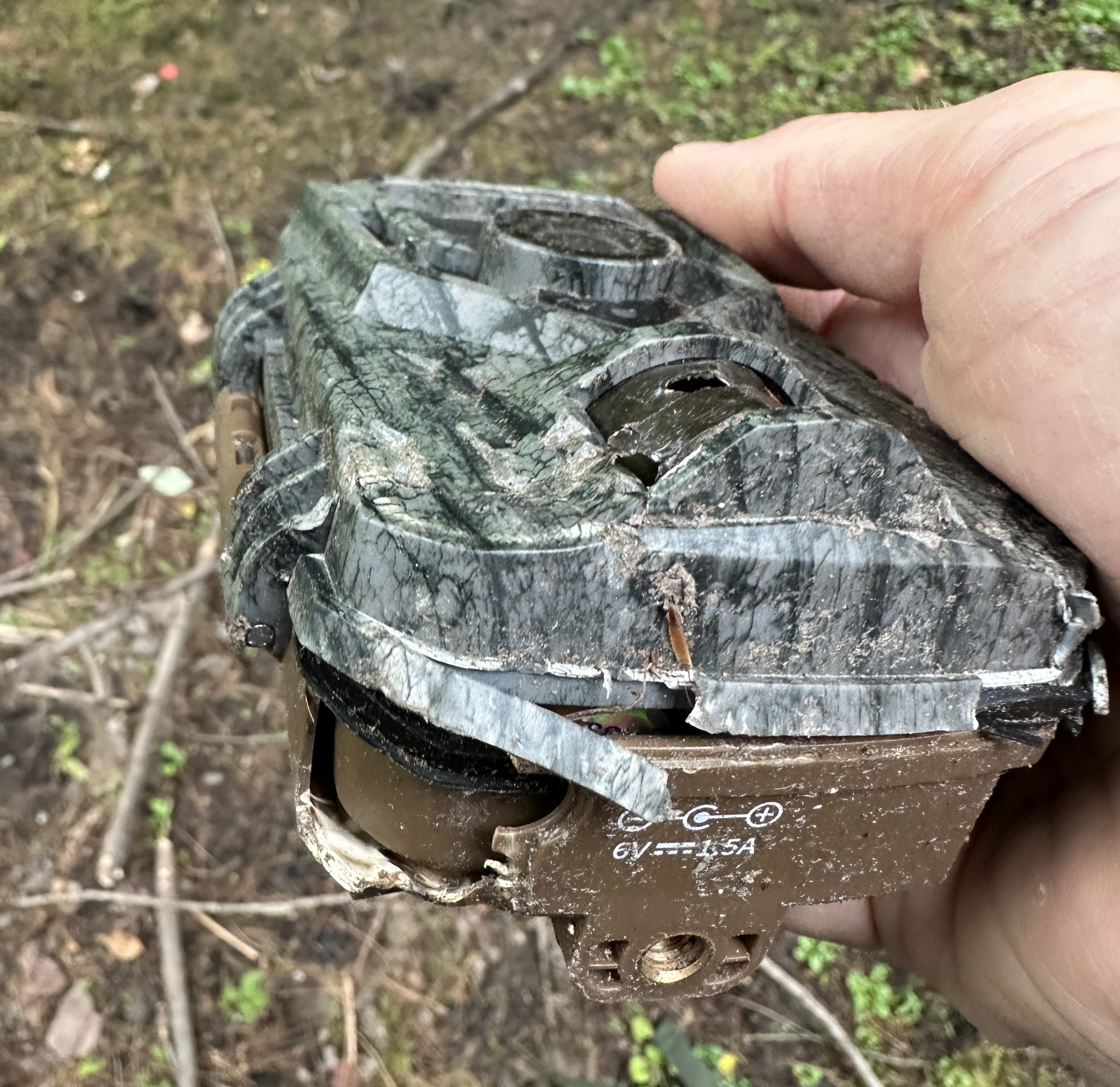 That camera was pretty well chewed up, as shown below. It still works! The internal display is broken, so I cannot review or change any settings; the exterior case has a big hole, so it is not weatherproof; the motion sensor is cracked and scratched. I’ve retired this camera.