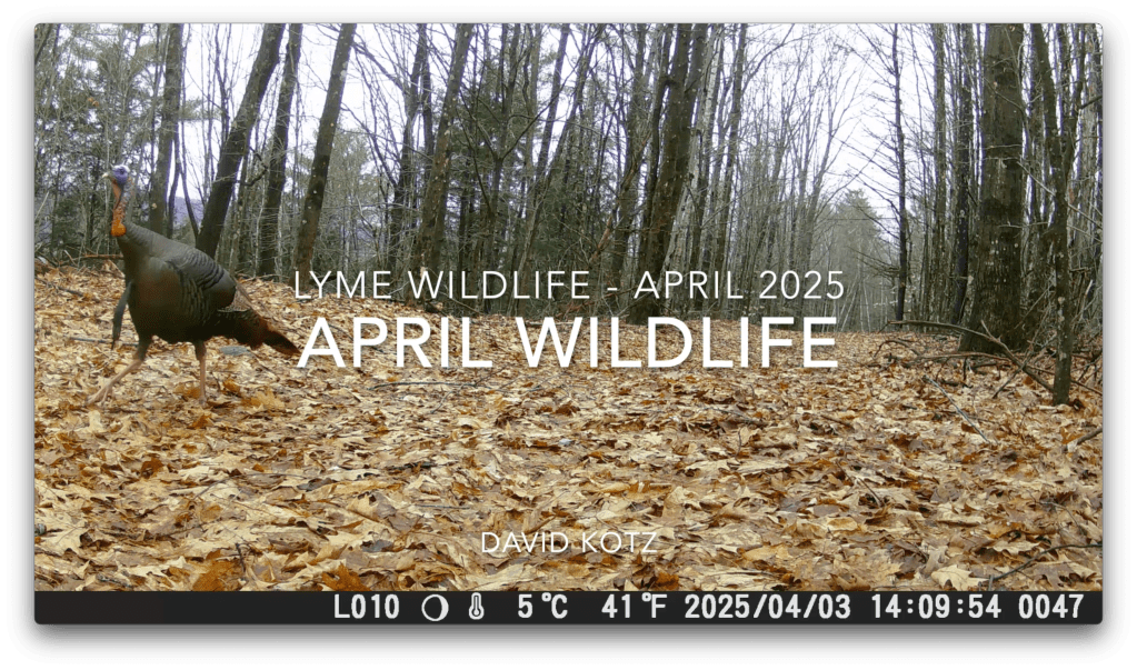 On a cold day in early April, this trail gave me the opportunity to come face to face with one of my subjects. Perhaps because of the downslope breeze and a light mix of drizzle and freezing rain pattering loudly on the leaf litter of the forest floor, the white-tailed deer did not see or hear me coming. I started recording video, while stepping gently closer and closer. I include that encounter in this month’s compendium of camera captures from the summit and nearby. Check it out! and you’ll see turkeys preparing for mating season, and coyotes sniffing for opportunity.