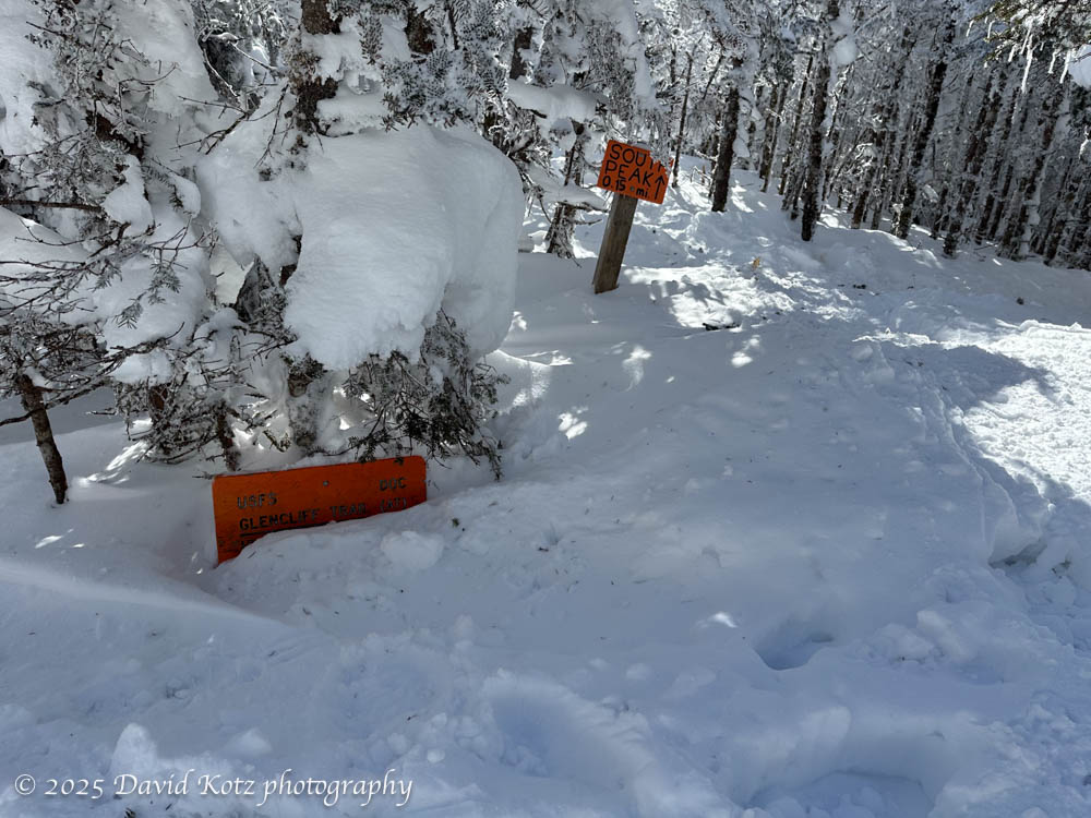 The miles rolled by as we ascended Gorge Brook, hung a left on the Snapper Trail, then a right on the Carriage Road. Before long we had reached the junction with the Glencliff trail, where both meet the ridge between the South and North peaks of Moosilauke. At this point I had flashbacks to my February ascent of the Glencliff trail, four months ago tomorrow, when the snow was so deep I literally had to crawl because the snow’s surface was nearly touching the overhanging trees. Wow! what a contrast with today. Compare the left and right in each pair of photos below: