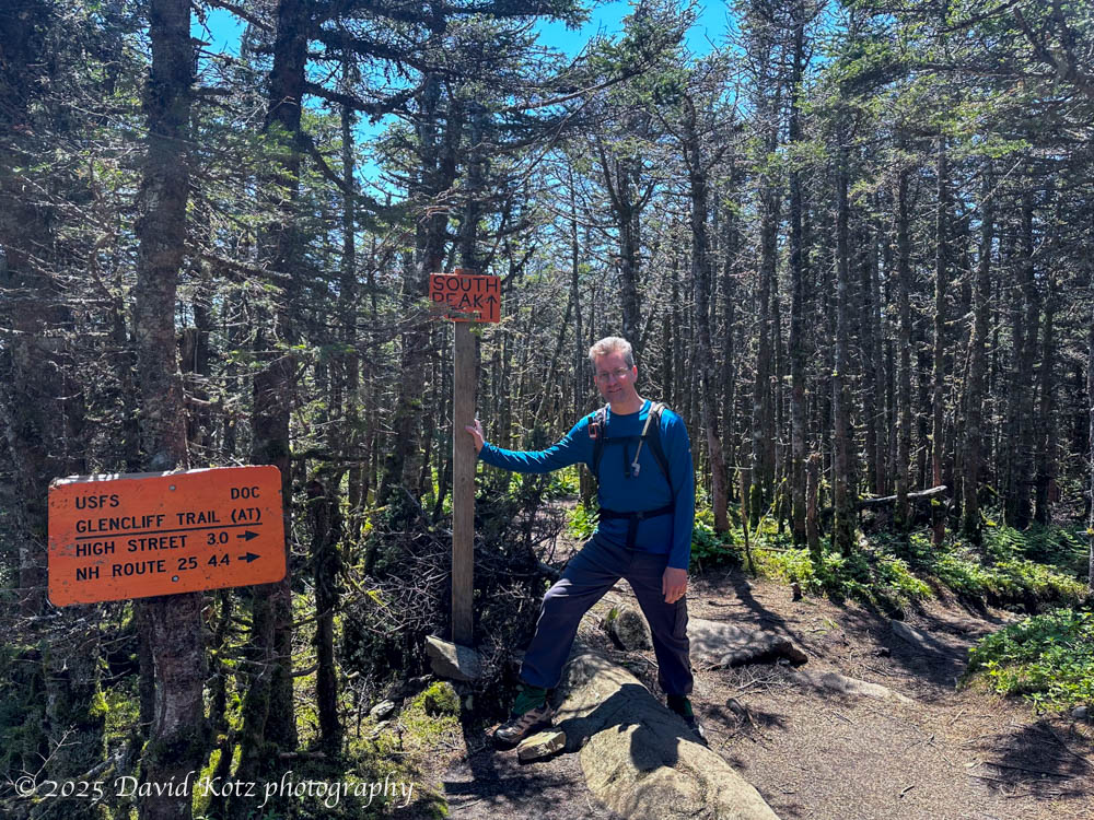 After a short jaunt to the South Peak for lunch and some hazy views to the west and southwest, two of our group turned back while Catherine and I forged ahead. We strode quickly across the Carriage Road – instead of crawling on a deep snowpack, as I had in February. Along the way, we met the Floki, the amazing cat who (four years ago) climbed all 48 of New Hampshire’s highest peaks! Today, Floki was getting a ride in a backpack: