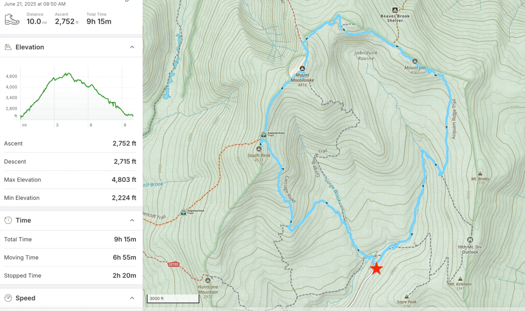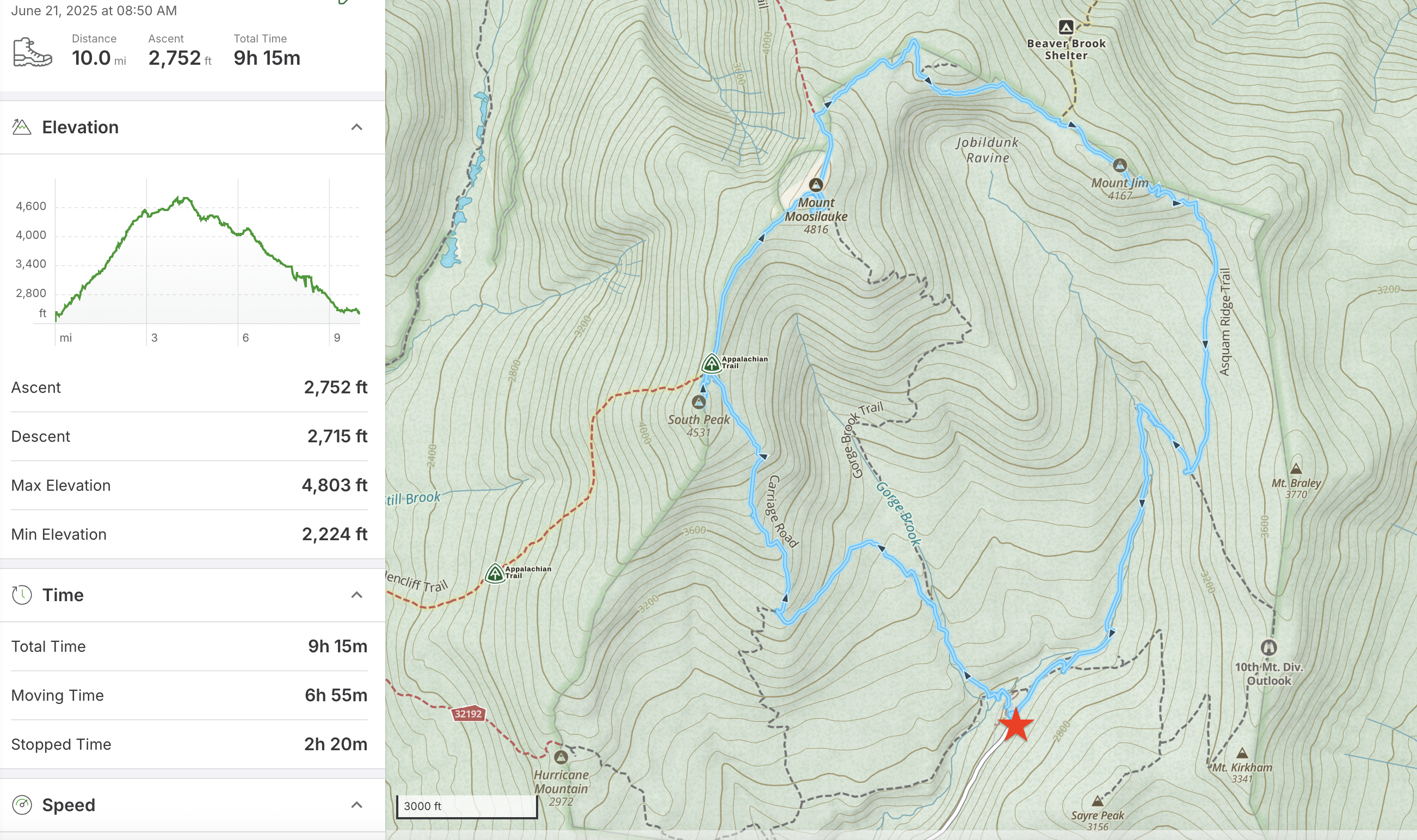 Ten miles in nine-plus hours, a long day by any count. We gratefully rolled into the Lodge just before dinner, where new friends awaited. Yet another fine day on Mount Moosilauke!