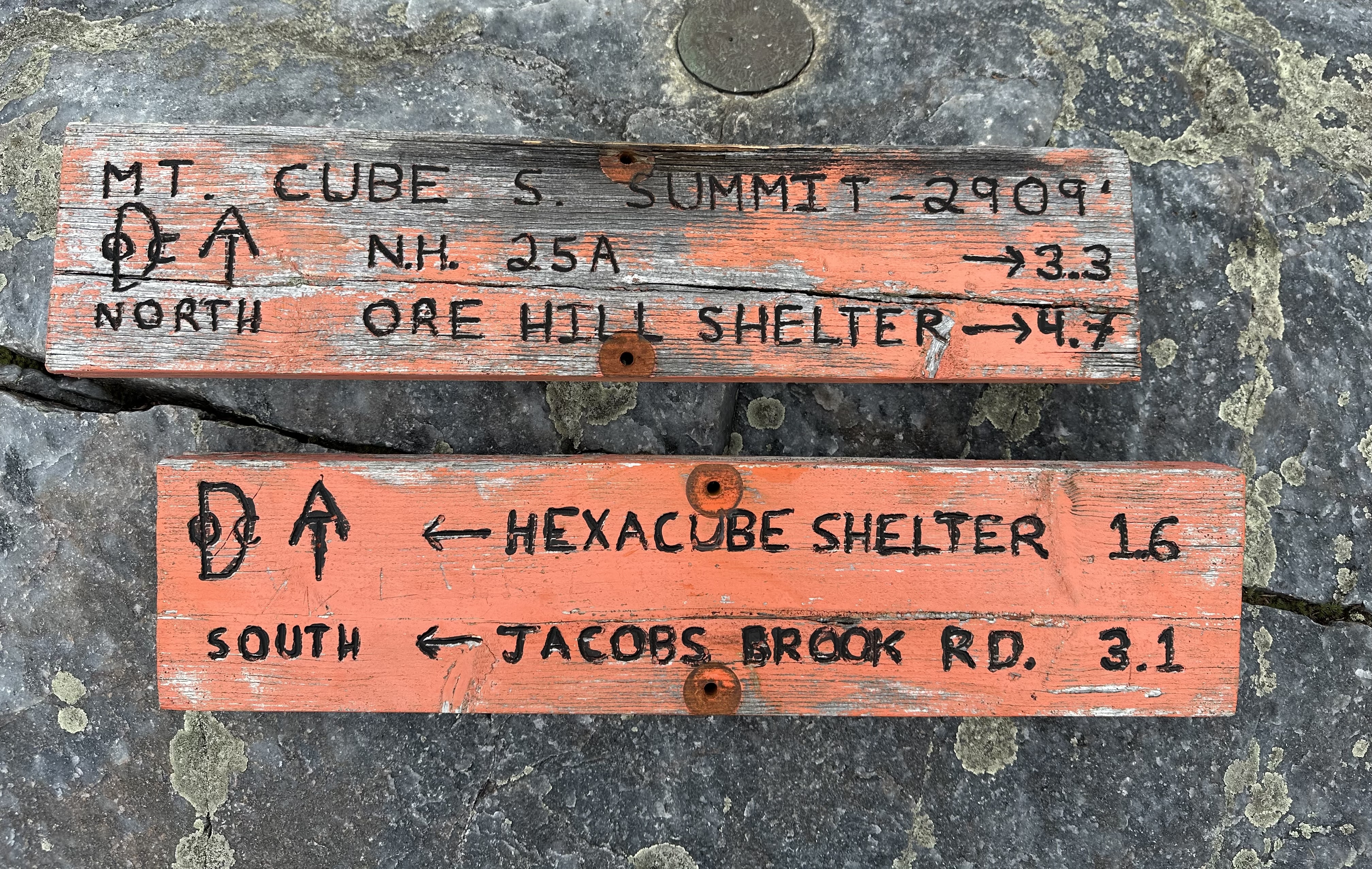 Later that day I saw one of my old DOC friends, who had been active in both DOC trail maintenance and in the creation and construction of the Cross Rivendell Trail. “Hey, I made that sign!” he exclaimed, noting that he had placed it on the summit in 2001. That sign – at top in the photo above – has guided thousands of hikers over more than two decades. It went home with him. The other is now with the DOC.