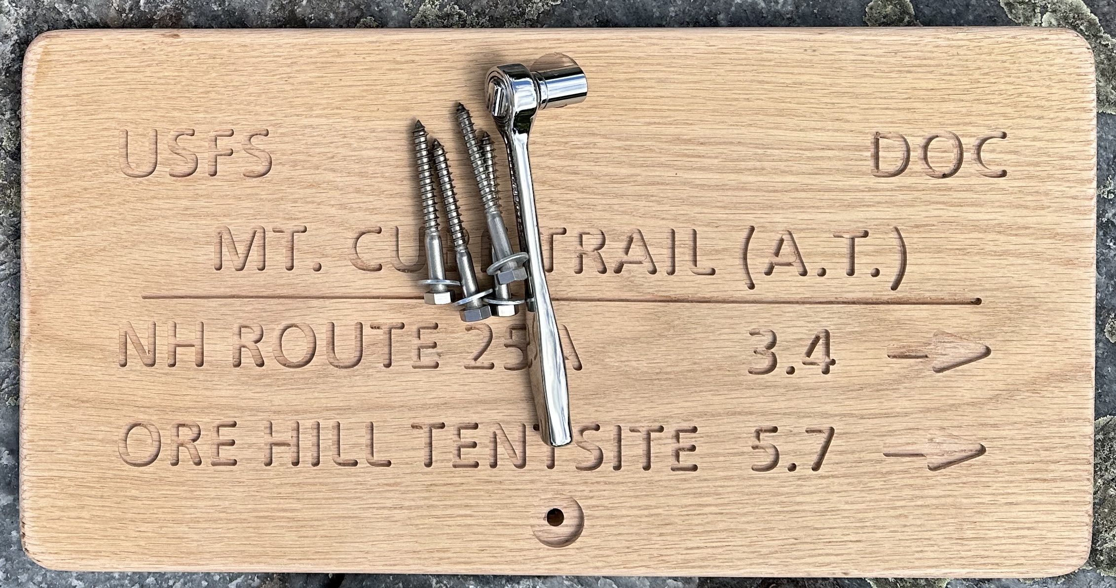 Today, I arrived at the rocky summit to find partly cloudy skies, a light breeze, and only two other people present. Wearing green uniforms and wielding hammers and wrenches, they were busy removing the orange-and-black, hand-routed, DOC signs (placed by the Dartmouth Outing Club, who maintains this section of the A.T.), and replacing them with unpainted, machine-routed, official US Forest Service signs. Although I was sad to see these classic DOC signs removed, they were indeed tired and in need of replacement. I offered to return the signs to the DOC, as mementos.