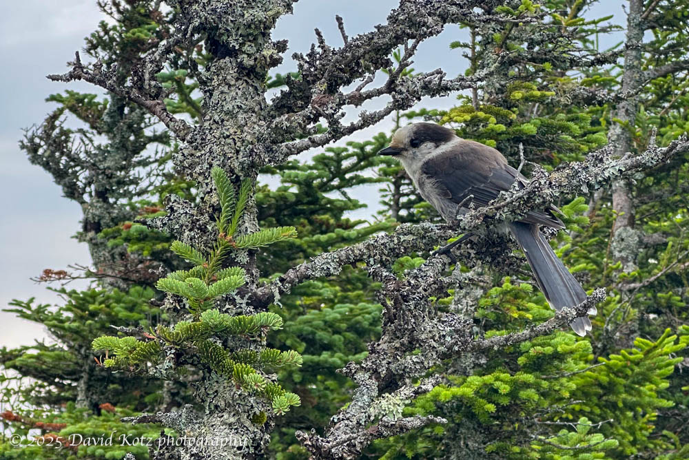 Despite the sweaty conditions, the hike was nonetheless worth it. I passed almost nobody all morning – just two people as I climbed the Drake’s Brook trail – and was alone on each of the two summits. Sadly, despite the guidebook’s promise of fantastic views, each summit was ensconced in cloud as shown above. On the summit of Sandwich, I sat for 15 minutes to eat my, um, sandwich (really!), an early lunch, as I was eagerly observed by two Gray Jays (also known as “camp robbers”). [video] They arrived less than two minutes after me, knowing full well that many hikers drop crumbs … or even offer nibbles on outstretched hands. I kept my food to myself.