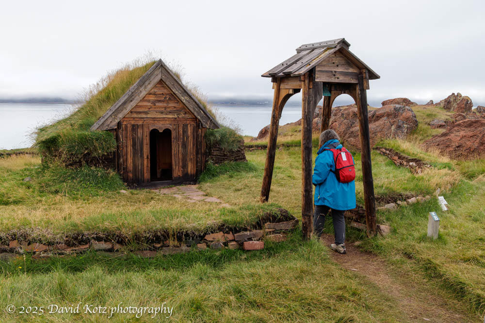 The next day we visited Brattahlíð, the other location where Erik the Red established a settlement in 982 CE, having been exiled from Iceland. (Coincidentally, during our trip to Iceland last summer, we visited the ruins of his earlier settlement, where he had settled after being exiled from Norway!) Here, in a small sheep-farming community known as Qassiarsuk, we encountered a monument installed in 1982 to celebrate the 1,000 year anniversary of the Norse arrival. After a short walk to the edge of this tiny contemporary community, we viewed the ruins of a Norse longhouse and church, and went inside reconstructions of the same. The tiny church is believed to be the first church built in Greenland – indeed, likely the first church in the Americas!
