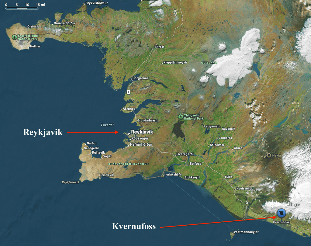 As my sixth waterfall of the day I visited Kvernufoss, a short walk from Skógafoss. As I followed its brook up into a ravine, I encountered only a few other visitors. At one point, at a particularly nice viewpoint, I took a mental snapshot of a young couple – the man smiling, the woman holding her left hand upright, a shining diamond ring on her finger – while an older woman with a professional camera took photos. An engagement! How heartwarming. I did not disturb them, and traveled onward. Kvernufoss falls from a high cliff above, and has eroded a massive bowl in the tuff… enabling visitors to walk behind the waterfall and look through the cascading water to the ravine and the lowlands beyond. Spectactular! Read on…