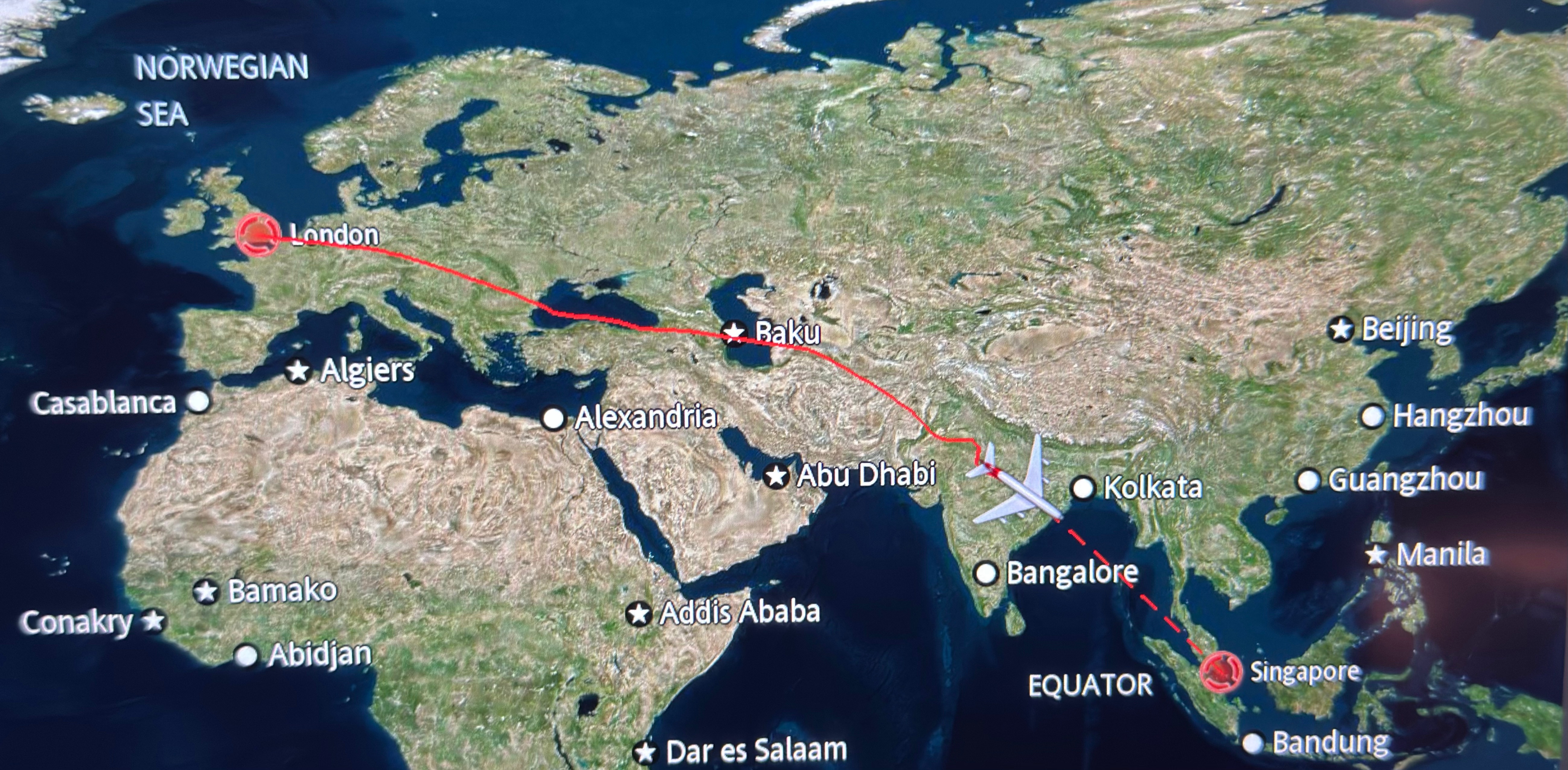 photo of a map showing our actual route from London to Singapore, midway through the flight.