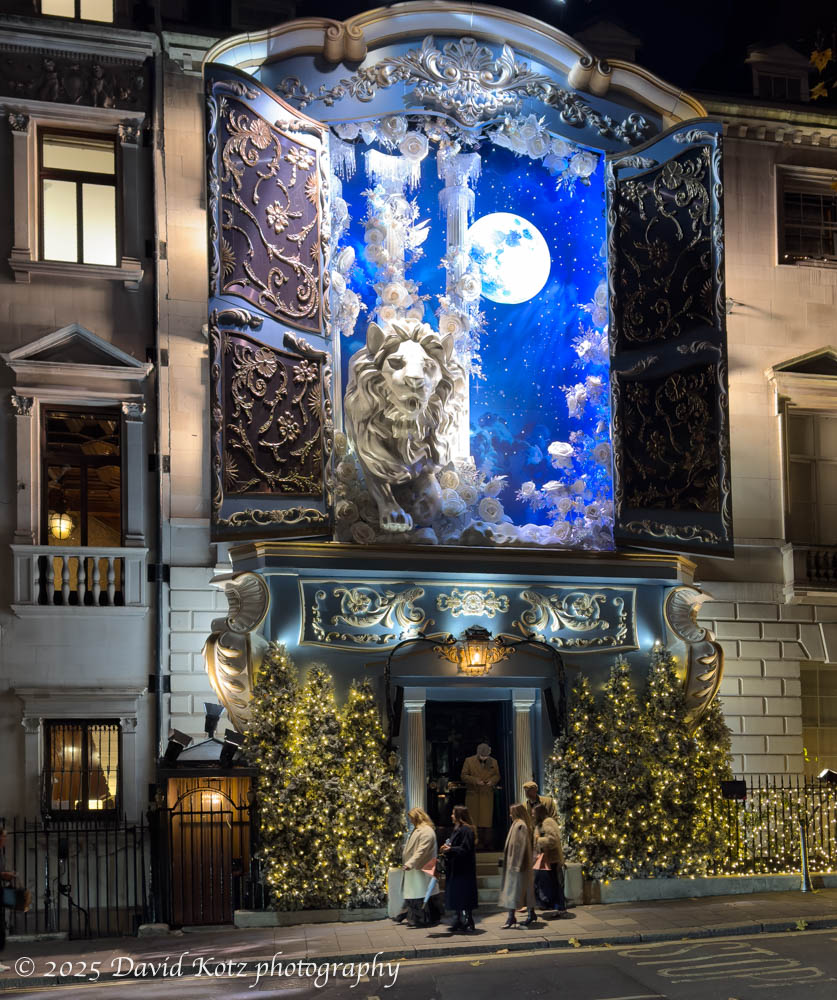 London goes all-out for Christmas, with homes, stores, streets, and squares boasting elaborate decorations. The long nights encourage beautiful light displays, often including massive designs that are draped along major shopping streets. Throughout December I’ve snapped photos of some of my favorites – and even my full gallery of photos doesn’t begin to demonstrate the breadth and depth of the decorations across the city. Perhaps the most elaborate was produced by Anabel’s, an exclusive club on Berkeley Square, London. Its entire façade has been overlaid with an fantastical scene inspired by the Narnia stories.