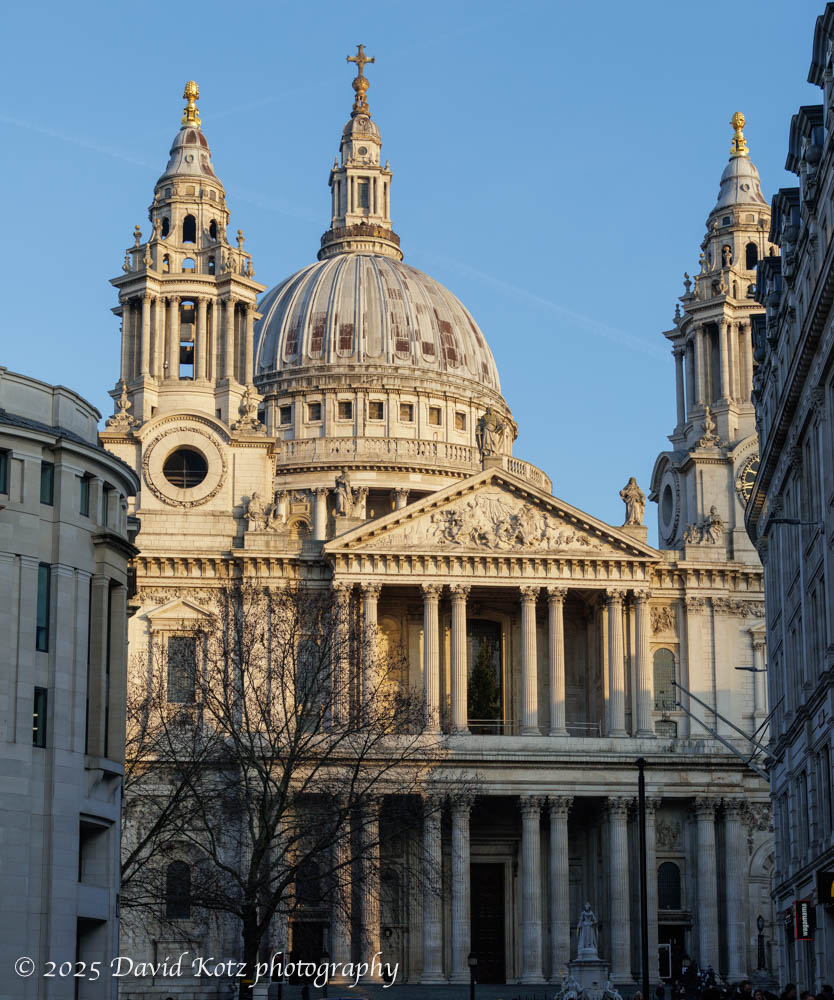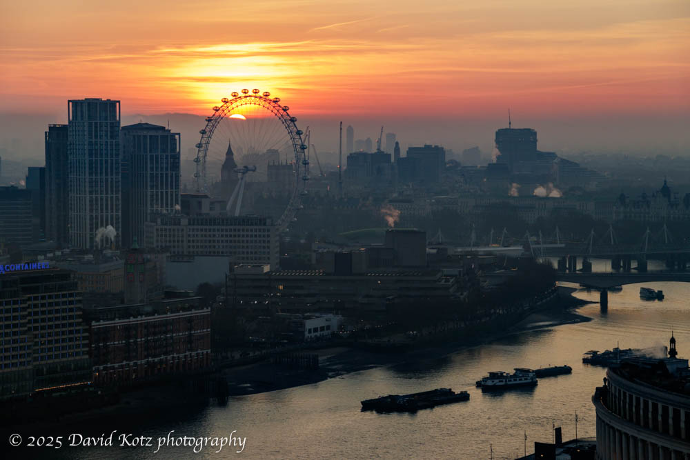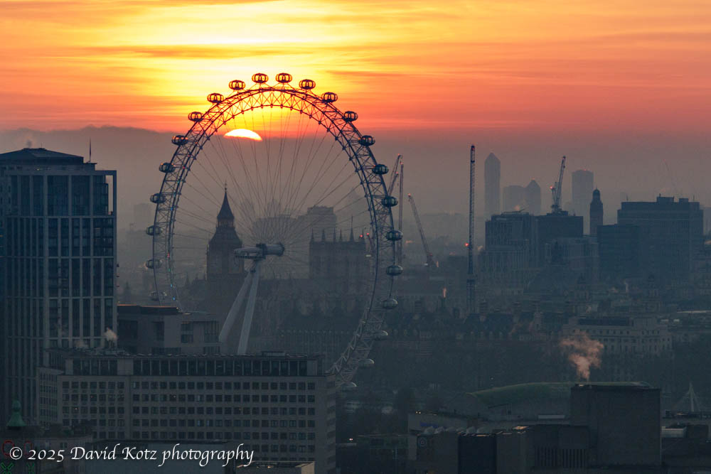I wanted to capture the last sunset of 2025 with an expansive view of London. So I climbed to the top of the famous dome of St. Paul’s Cathedral, squeezing my way up the ever-narrower spiral staircases and internal alleyways until I reached the Golden Gallery that circles the spire on top of the dome. It was 3:30, so I had a half hour to wait for sunset. Today the sky was clear, but the cityscape was filled with a light haze. As the sun sank lower, and the other tourists snapped their selfies to my left and right, I realized the sunset would be perfectly aligned! Below is the view just before the sun disappeared into the southwestern clouds, seen right through the London Eye, past Big Ben (Elizabeth Tower), Westminster Abbey, and our flat in Pimlico. Neat!