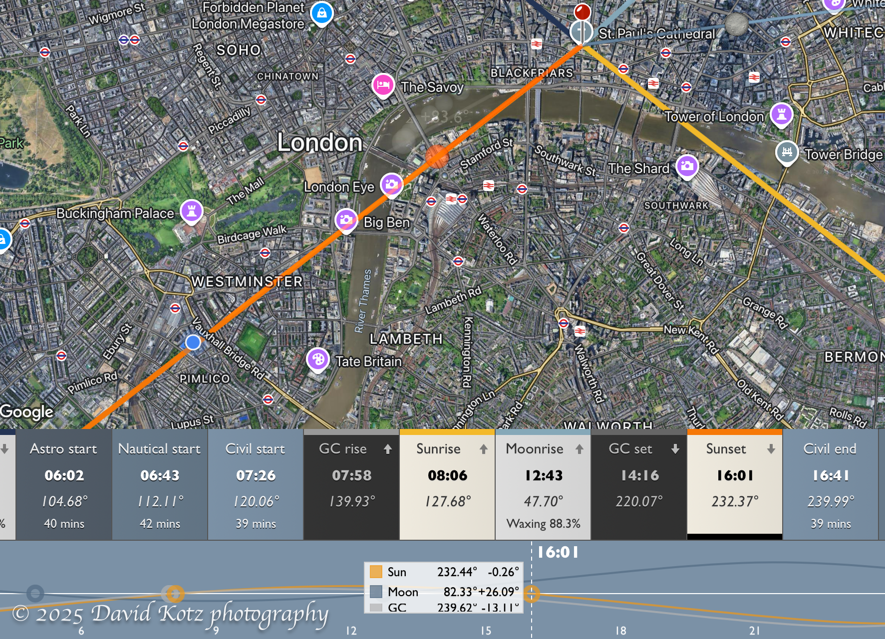 See more photos, full-scale, in the photo gallery. Below is a map, from The Photographer’s Emphemeris app, showing the alignment. St. Paul’s is at the top center, and the orange line shows the direction of the sunset to the southwest. The blue dot on the orange line shows the location of our flat. I only discovered this amazing alignment after returning home!