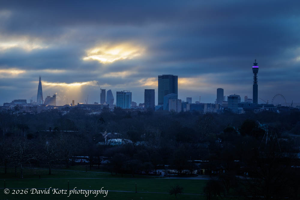 When I arrived, a bit after sunrise, the sun was hidden behind thick clouds – just as it had when I was last standing on this spot, on solstice. Today, unlike then, patience paid off… and the sun emerged, spilling “god rays” among London landmarks like The Shard.
