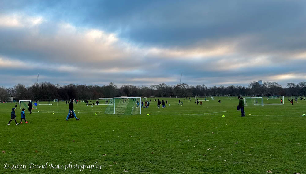 I walked down the hill and past London Zoo into Regent Park – with a brief glance at Regent Canal as I crossed over the path of one of my December hikes. Along the pathway I joined a crowd of parents and children heading for the football pitches. Although the ground was frosted and the sun was struggling to eke its way through the clouds, the children were buzzing with excitement as they warmed up for Saturday matches.