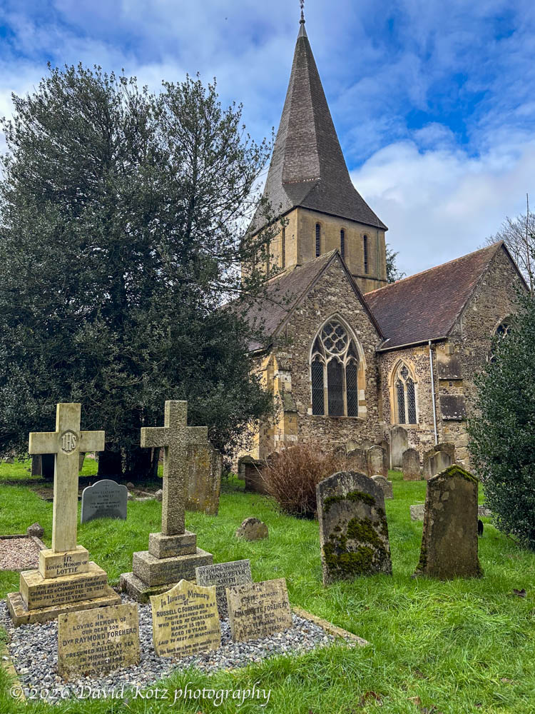 According to this page, it dates to c1200. That page also describes the anchorite Christine Carpenter, who had herself ‘enclosed’ – locked into a tiny cell attached to the church – for many years. Nearby, the tiny town of Shere is quaint and pretty; its tea rooms and cafés were full with others who were out for a walk on this raw January day.