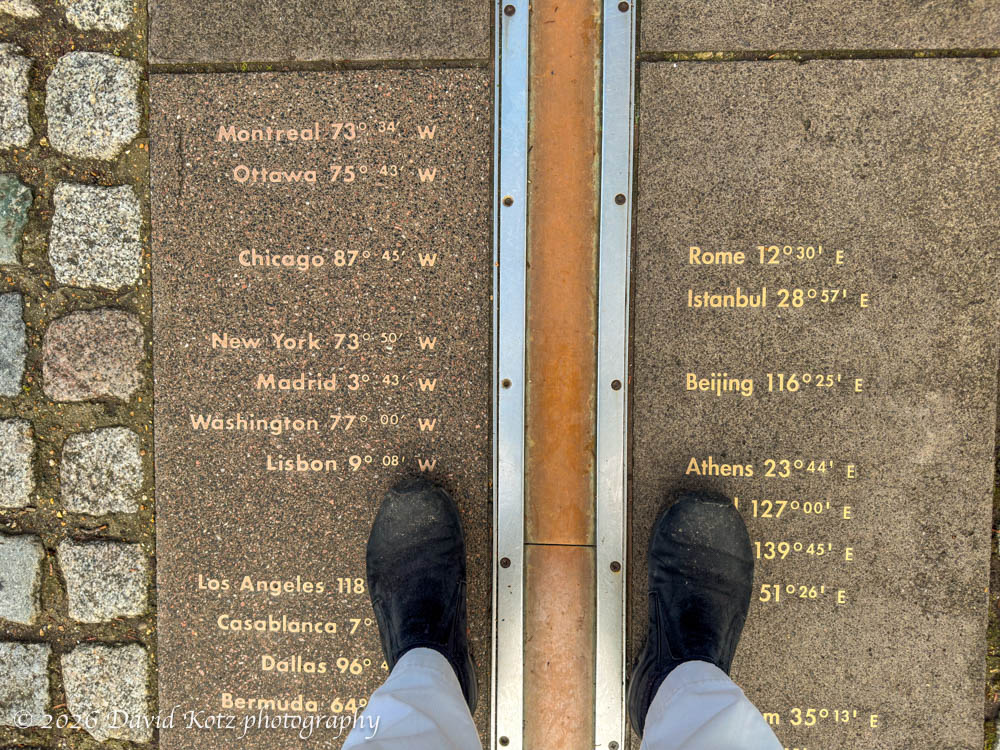 Today we visited Greenwich, and the Royal Observatory Museum that sits atop the hill in Greenwich Park. It has an expansive view across the park, past the Old Royal Naval College and the River Thames, to the skyscrapers in the Canary Wharf financial district of London. This observatory is where the question of longitude was studied – and in particular, a decades-long challenge to find a reliable means for mariners to estimate their longitude while at sea. As a result, it was later selected as the zero point – the reference point for 0º0’0″ longitude, aka the Prime Meridian. Given the importance of measuring time for measuring longitude, Greenwich was also designated as the basis for universal time – hence Greenwich Mean Time (GMT), now known as Universal Time (UTC). We and the other tourists had fun standing on the meridian, one foot in the Western Hemisphere and one foot in the Eastern Hemisphere.