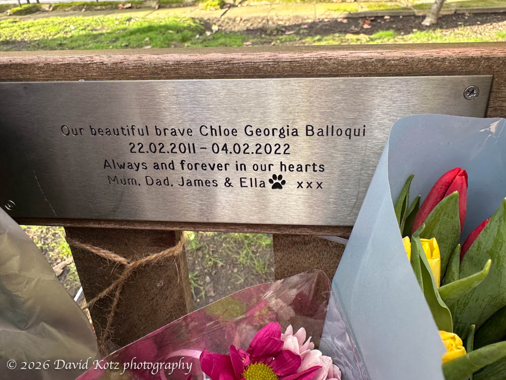 Looking closer, I could see this new bench had – like many other park benches – been dedicated to someone special. Today (22 February) would have been Chloe’s 15th birthday. I don’t know Chloe Georgia Balloqui, who died shortly before her 11th birthday, but she was clearly much loved and has not been forgotten. I stood for a long while, watching the balloons dance in the breeze, thinking of brave young Chloe.