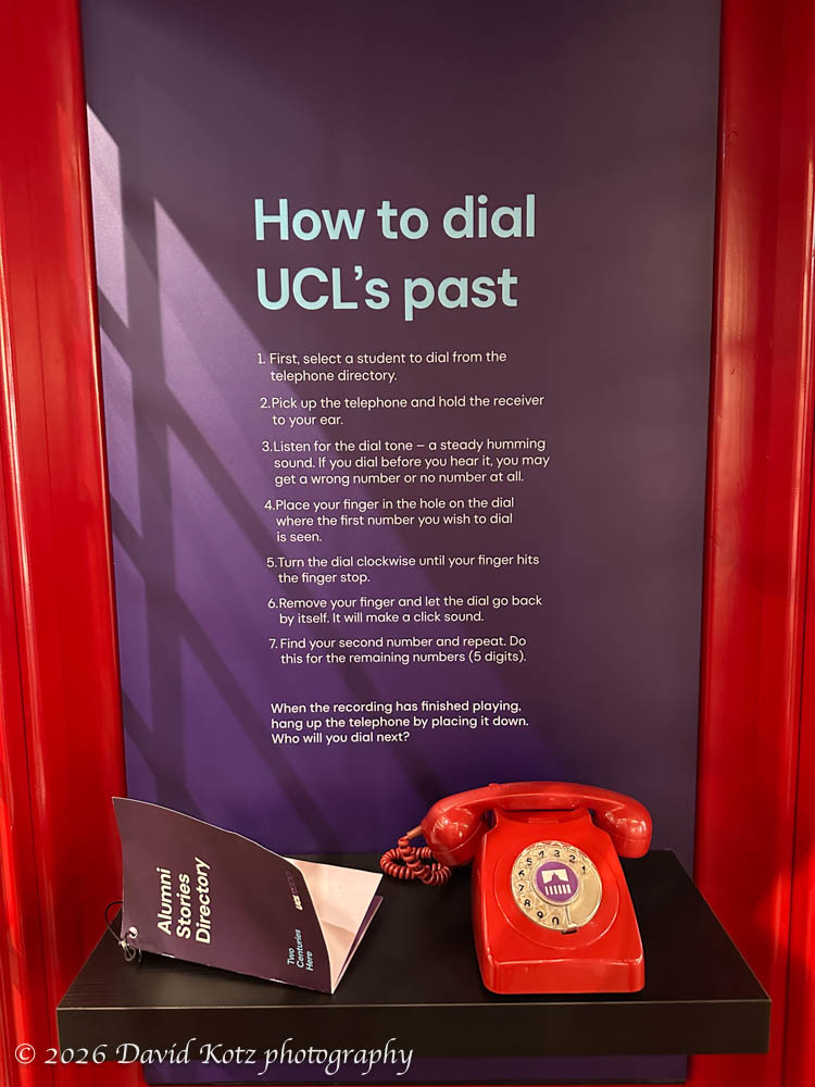 Inside a classic red London phone booth was a telephone handset – photo below. You step inside the booth, pick up the handset, and then dial a five-digit number corresponding to one of the alums pictured in the little phonebook. You then listen to a short audio clip in which that alum, in their own voice, tells a brief story about their experience at the college. Very cool!